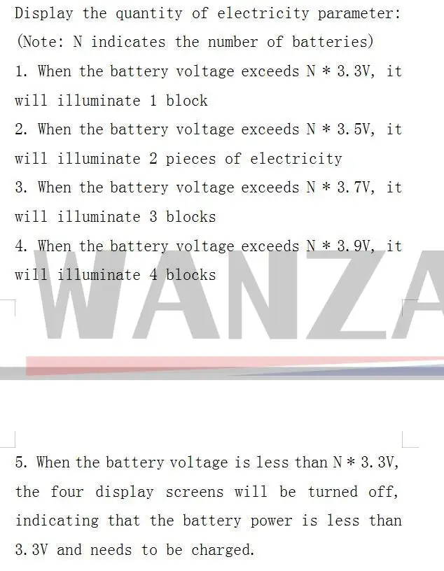 4.When battery voltage is over N*3.9V,it will illuminate 4 blocks electricity quantity