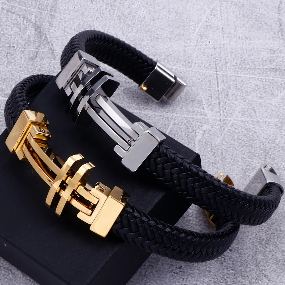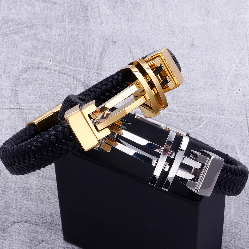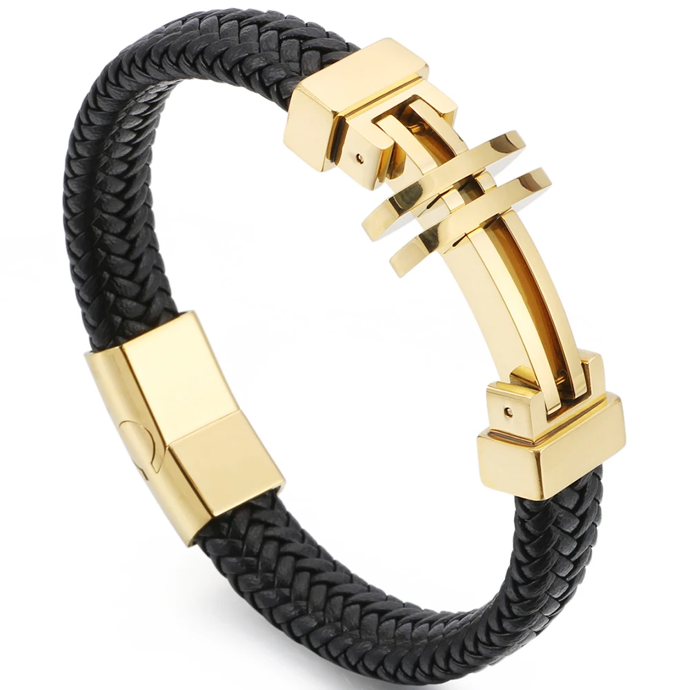 11MM Braided Genuine Leather Bracelet Men Gold Stainless Steel Mens Charm Bracelets 2020 Handmade Male Jewelry Wrist Band Men