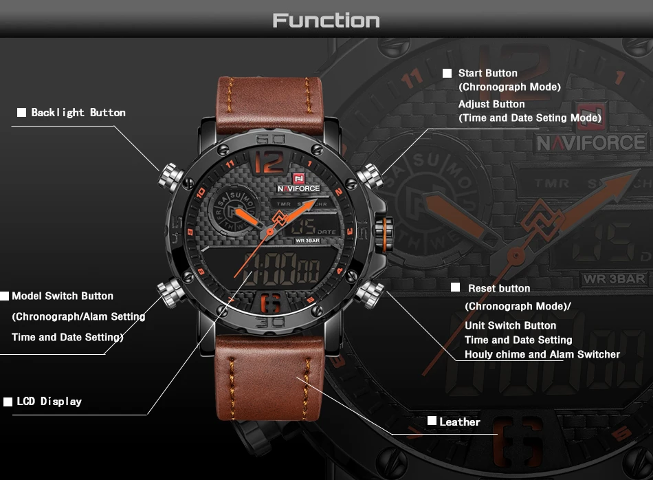 | Feature | Water Resistant,LED display,Stop Watch,Auto Date,Back Light,Complete Calendar,Week Display,Alarm,Chronograph,Repeater |