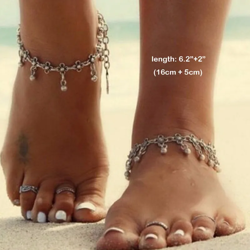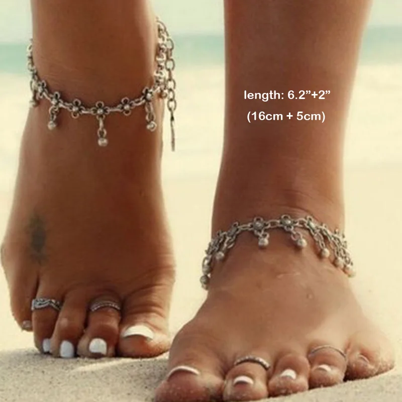 2pc/lot Hollow Carved Clover Anklet, Water Droplets Tassel Bell Ankle Bracelet, Plated Silver Anklets for Women Indian Anklet