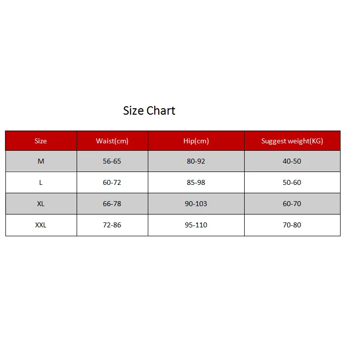 XL: Waist 66-78cm; Hip 90-103cm; Suggest Weight 60-70kg