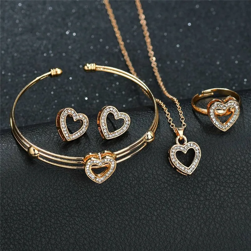 4 pcs Cute Heart Shaped Bracelet Neclace Earrings Sets Jewelry Crystal Kid Children Lovely Gold Color Jewelry Sets for Girl