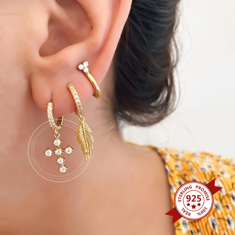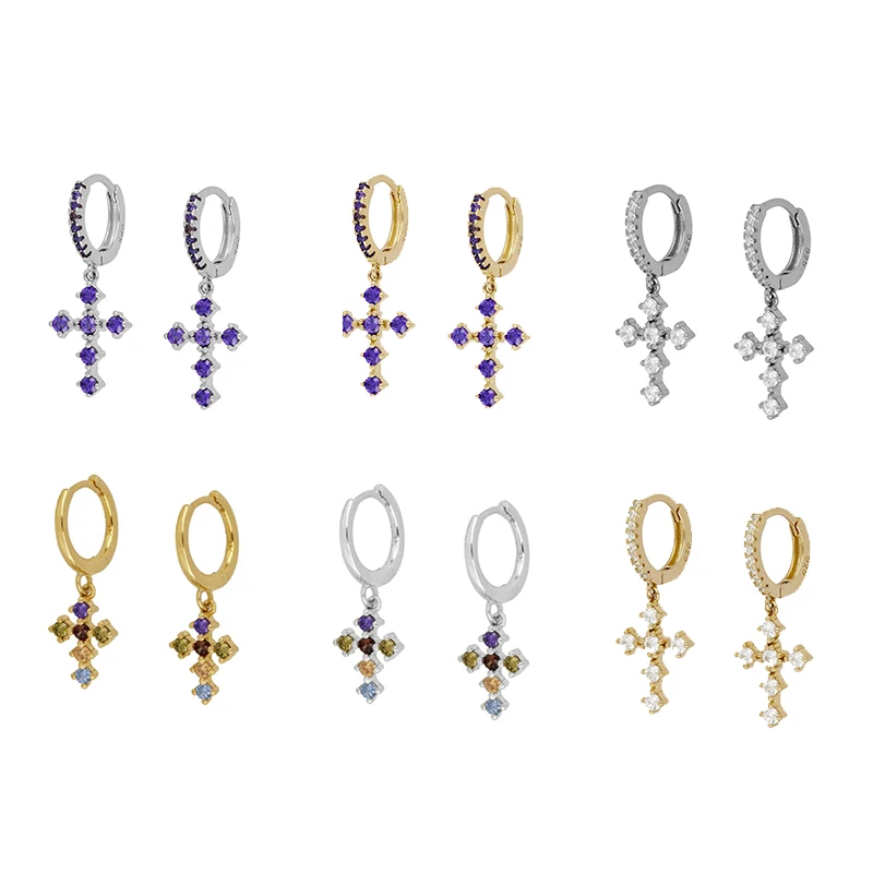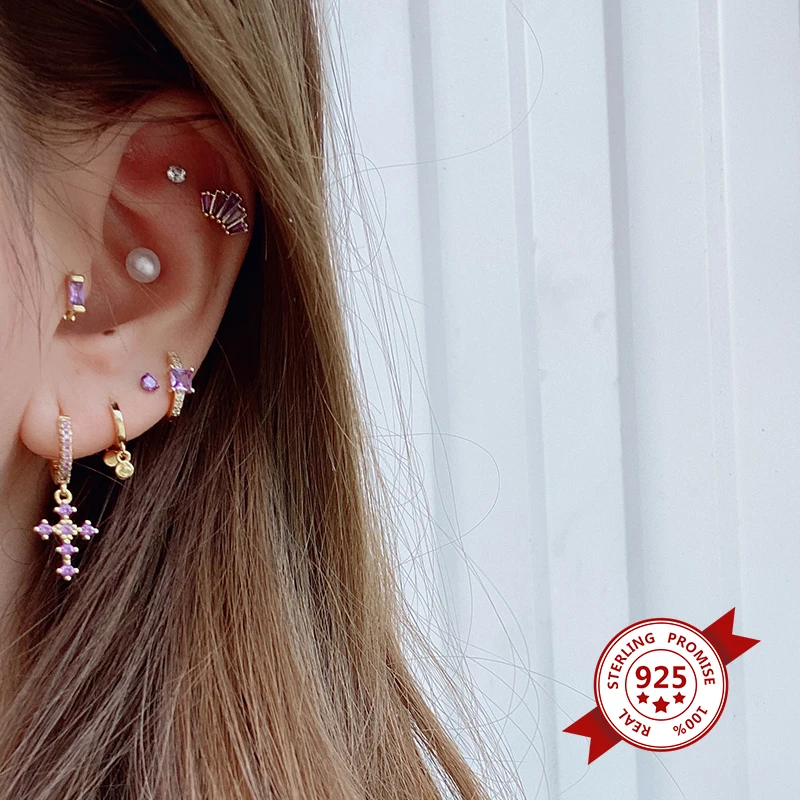 925 Sterling Silver Rainbow/Purple/White Zircon Cross Pendant Hoop Earrings for Women Simple Circle Earrings Fashion Jewelry
