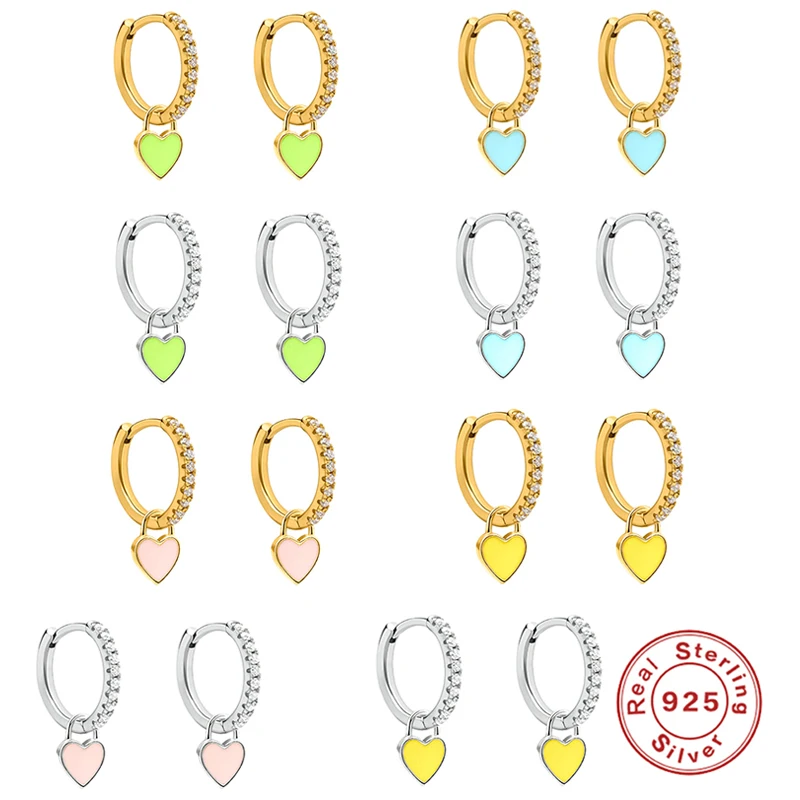 Aide 925 Sterling Silver Hoop Earrings With Cute Candy Neon Color Enamel Heart Charm Drop Earring Gold Silver Color For Girls