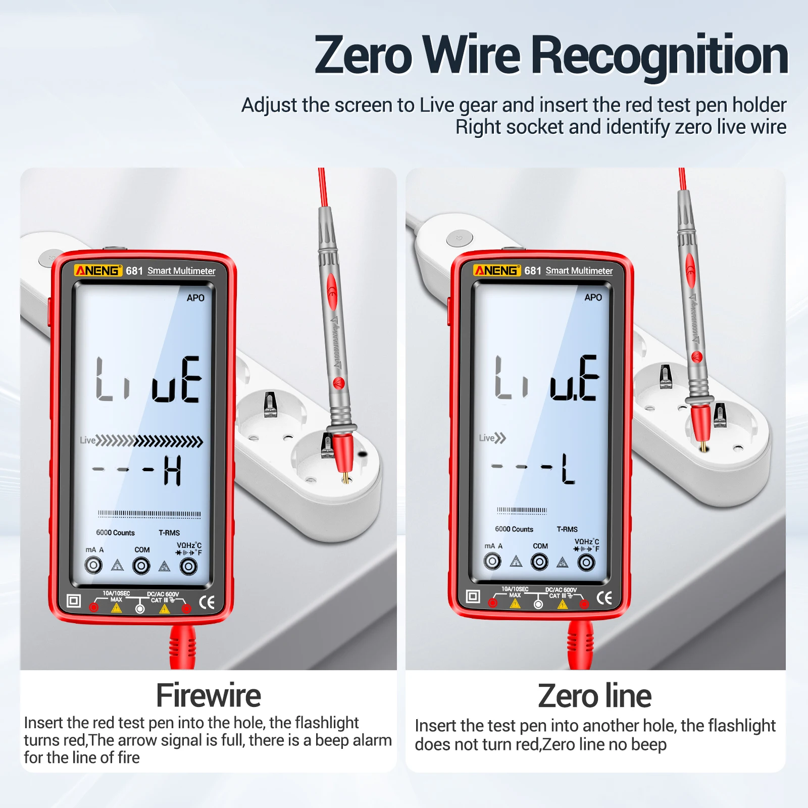 NCV Non-contact Induction: use the NCV sensor to sense, the closer to the power supply, the more rapid the alarm, and the flashlight flashes red.