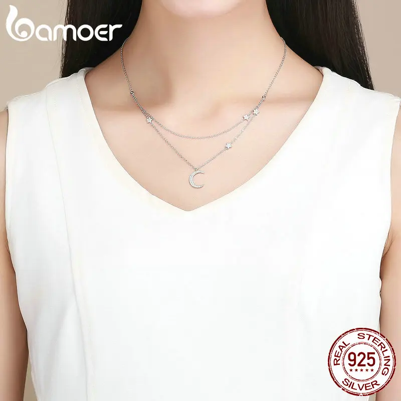 BAMOER Genuine 925 Sterling Silver Moon & Star Double Layers Chain Pendants Necklaces for Women Sterling Silver Jewelry BSN038