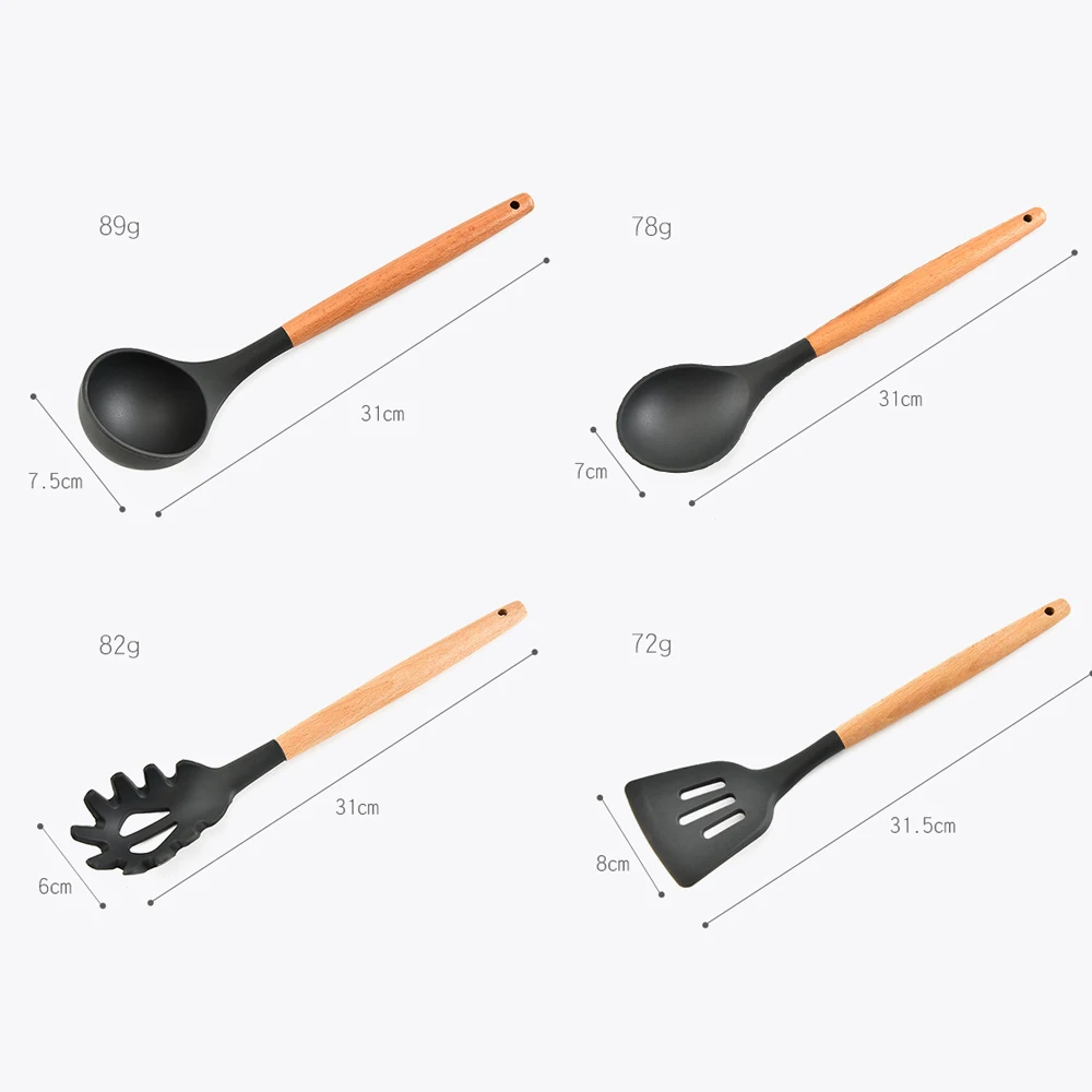 Best Silicone Cooking Utensil Set Wooden Handle Spatula Soup Spoon Brush Ladle Pasta Colander Non-stick Cookware Kitchen Tools