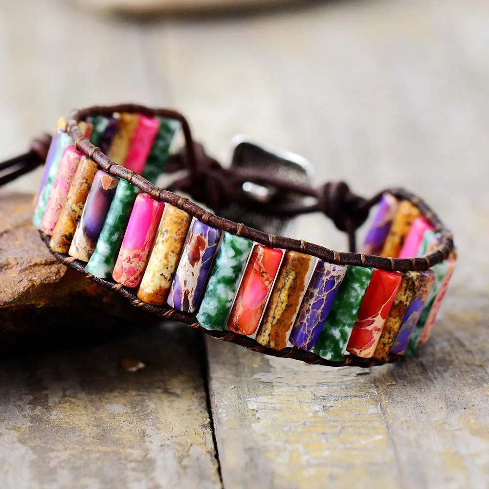 Boho Bracelet Tube Shape Natural Stone Single Leather Wrap Bracelet Semi Precious Stone Women Beaded Cuff Bracelet Dropship