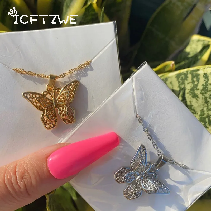 Butterfly Statement Necklaces For Women Stainless Steel Gold Pendants Chokers Collar Water Wave Chain Butterflies Jewelry Trendy