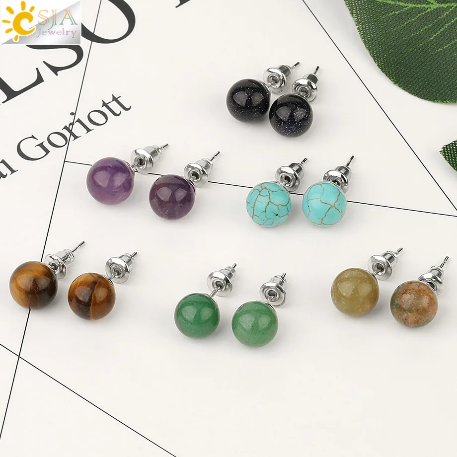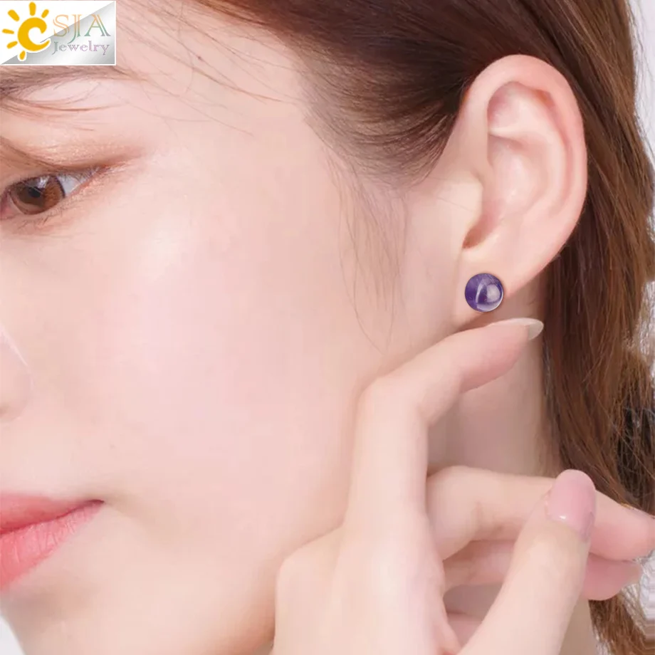 CSJA 8mm Natural Stone Stud Earrings Crystal Quartz Round Ball Beads Silver Color Simple Fashion Ear Jewelry for Women Girl G199