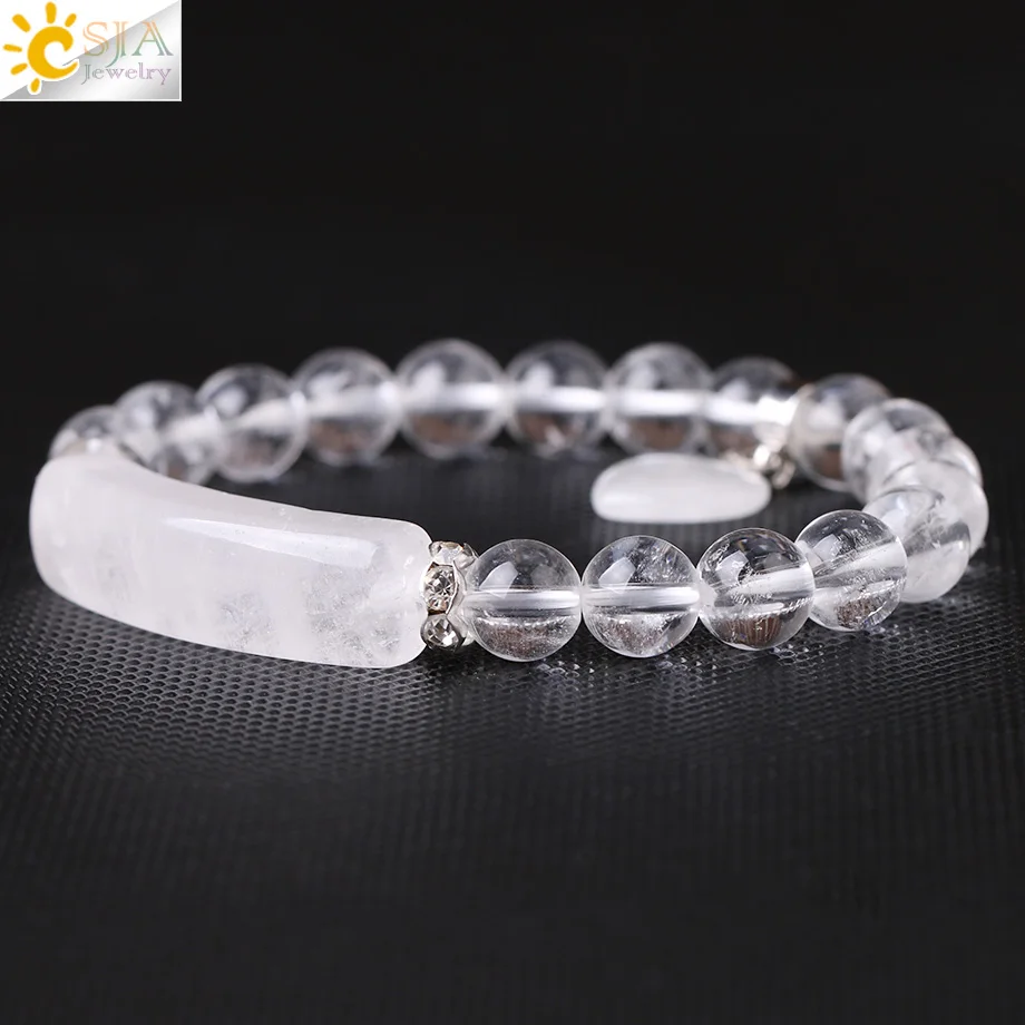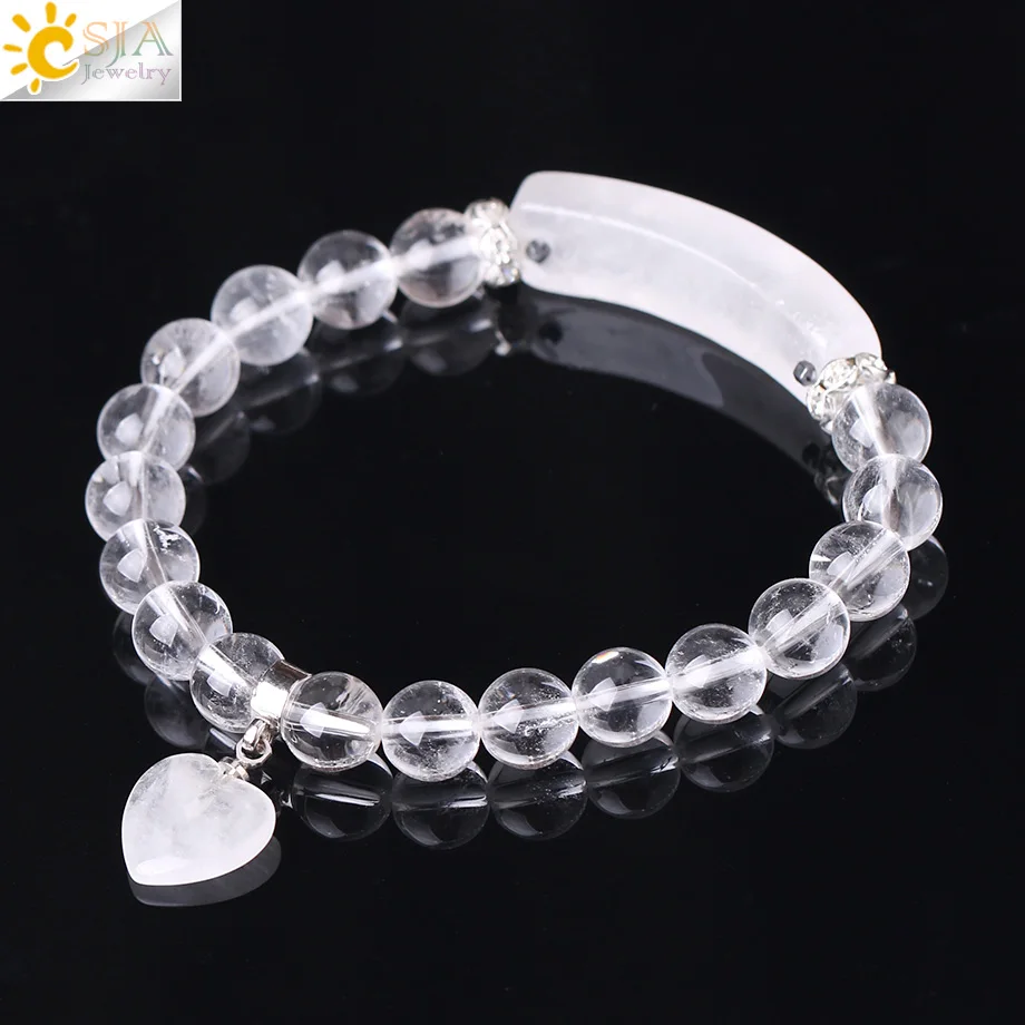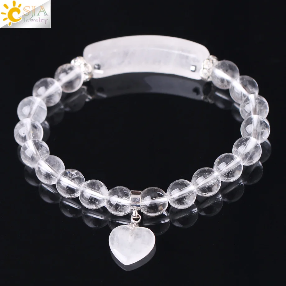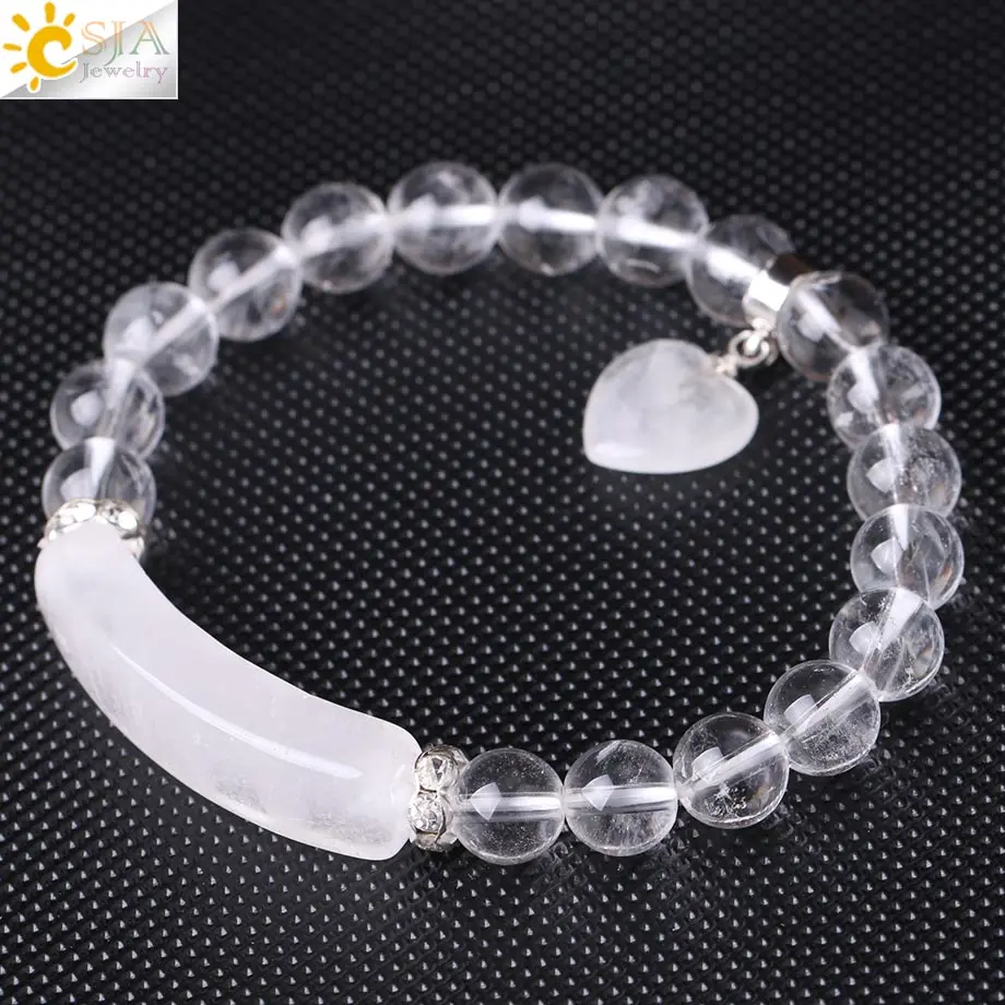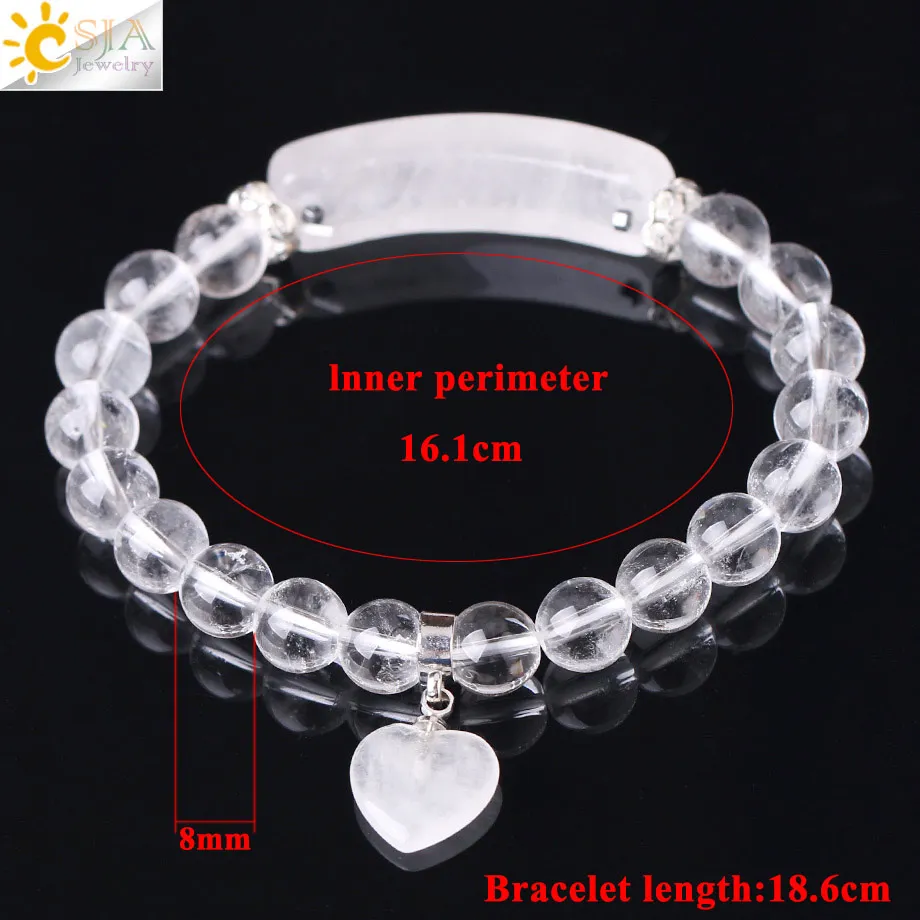CSJA Reiki Boho Natural Gem Stone White Clear Quartz Rock Crystal Bracelet for Men Women Lover Heart Pendant Chakra Jewelry F277
