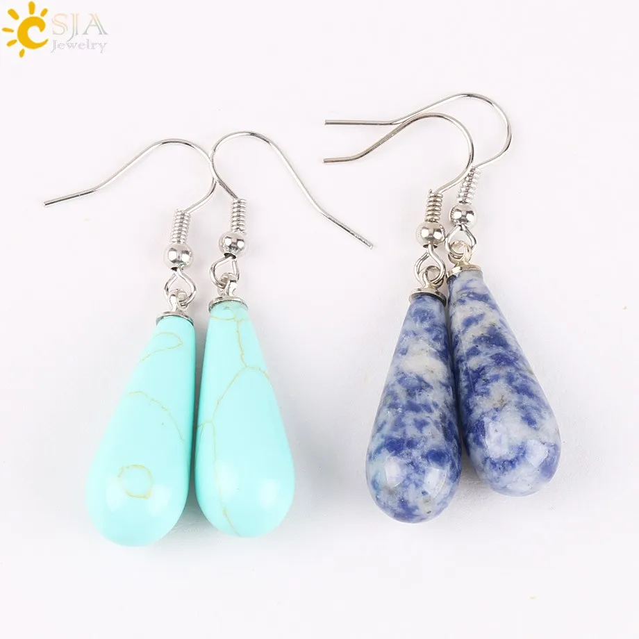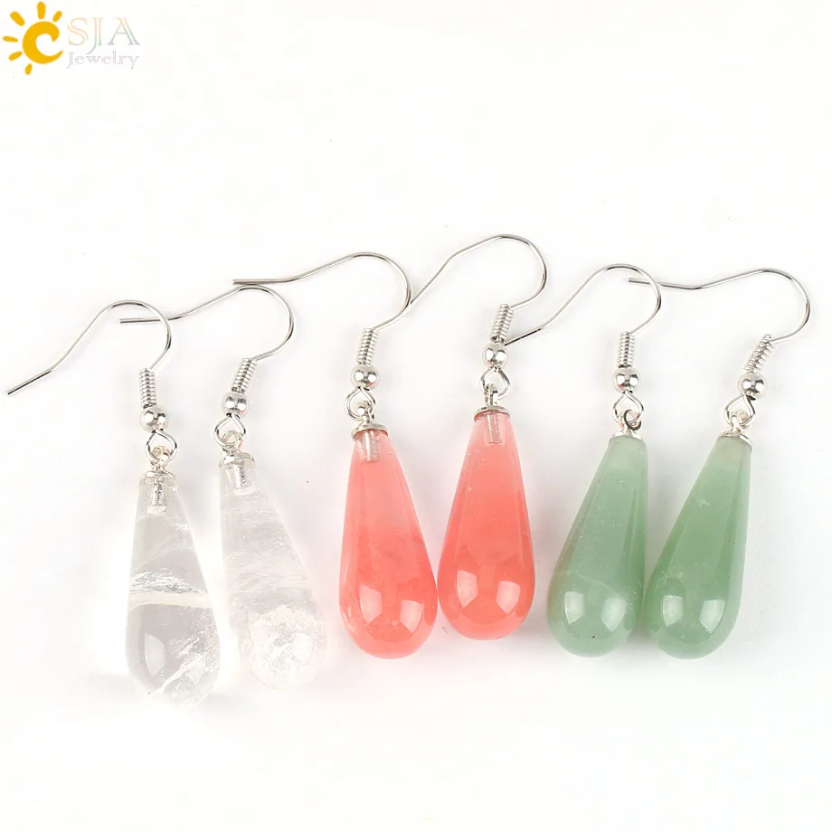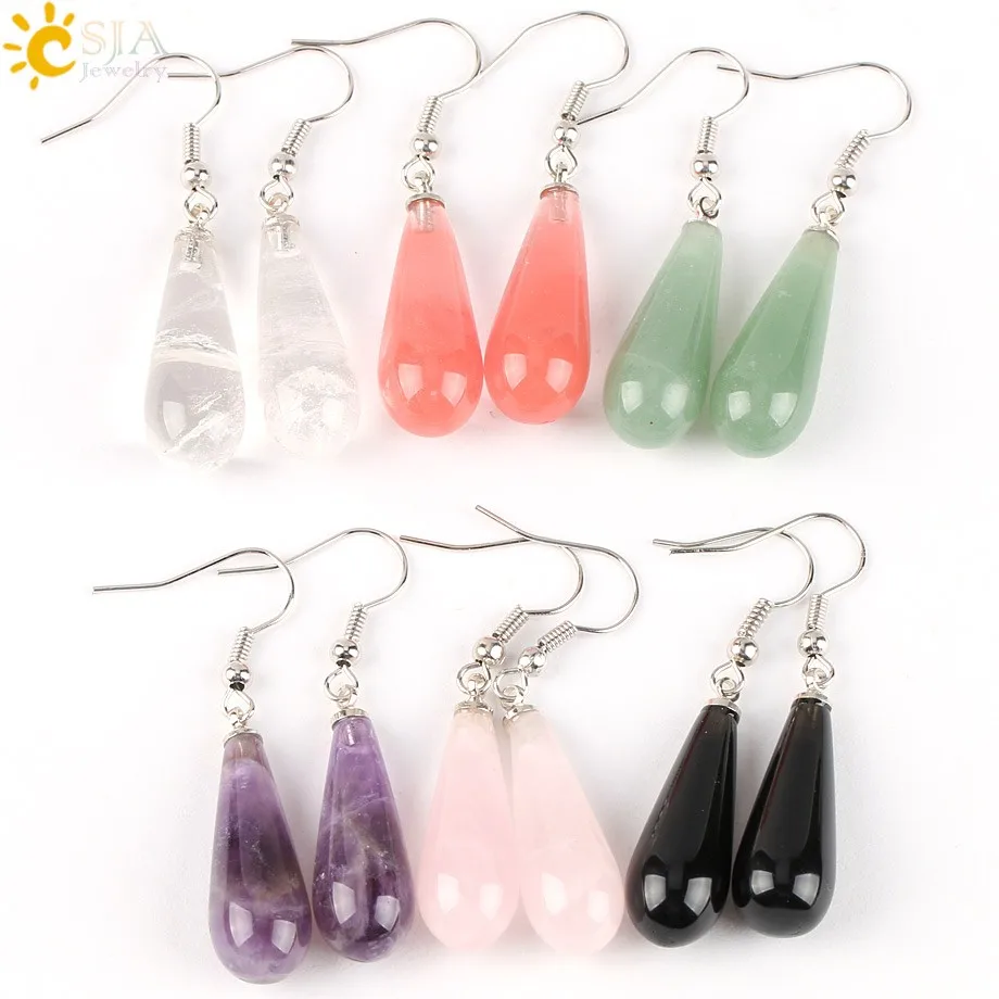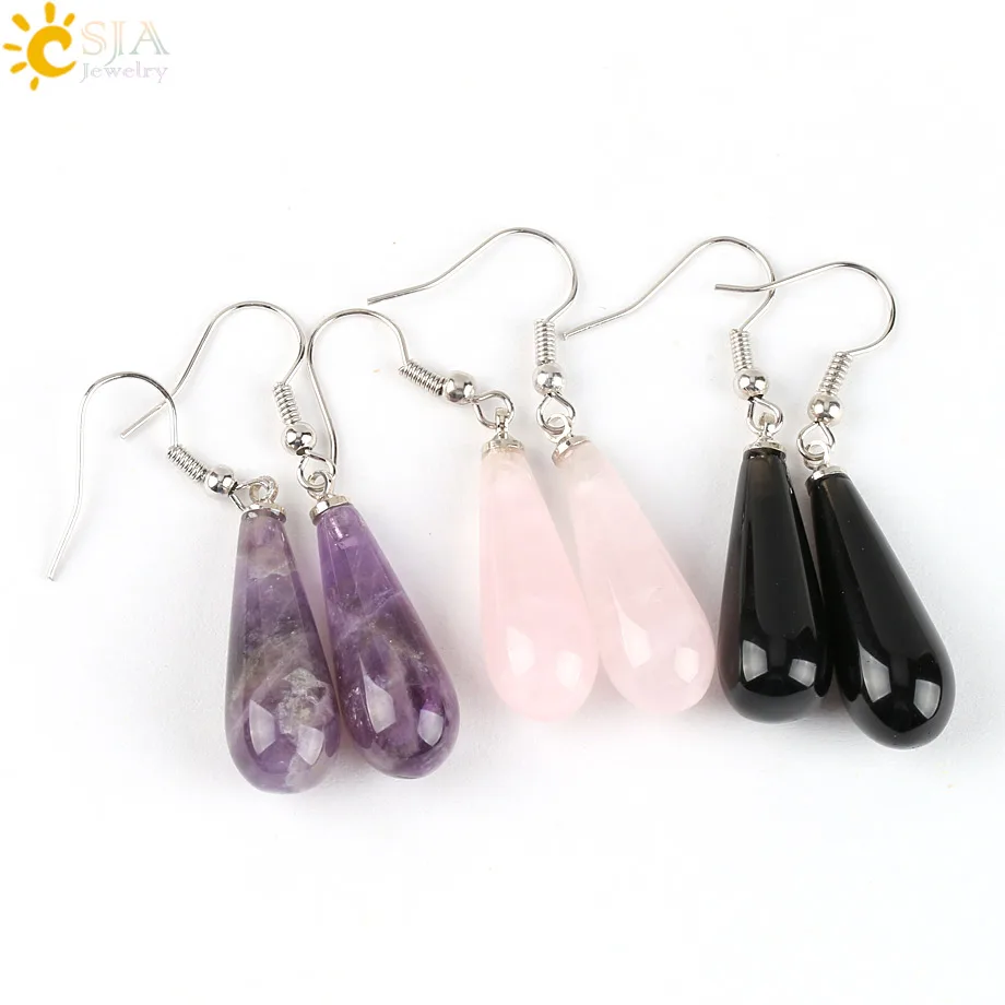 CSJA Summer Women Jewelry Natural Reiki Chakra Gem Stone Beads Pendant Water Drop Dangle Earring Pink Purple Crystal Gift E110 |