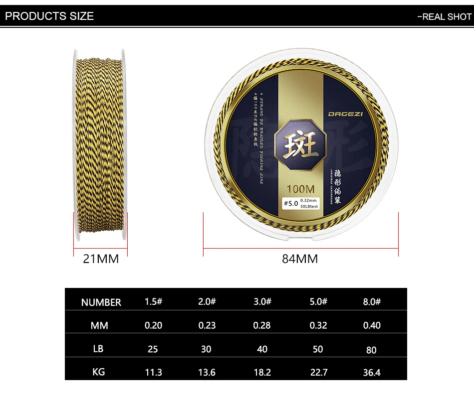 Line Number # 1.5: 0.20mm / 25LB / 11.3KG Line Number # 2.0: 0.23mm / 30LB / 13.6KG Line Number # 3.0: 0.28mm / 40LB / 18.2KG Line Number # 5.0: 0.32mm / 50LB / 22.7KG Line Number # 8.0: 0.40mm / 80LB / 36.4KG Package List: 1pc * 100M Fishing Line + gift