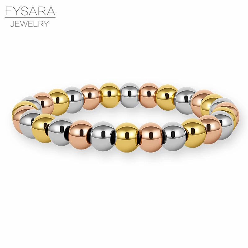 FYSARA 6mm/8mm Mix/Gold Color Stainless Steel Beaded Bracelet Bangle for Men Women Jewelry Black Round Bead Stretch Bracelets