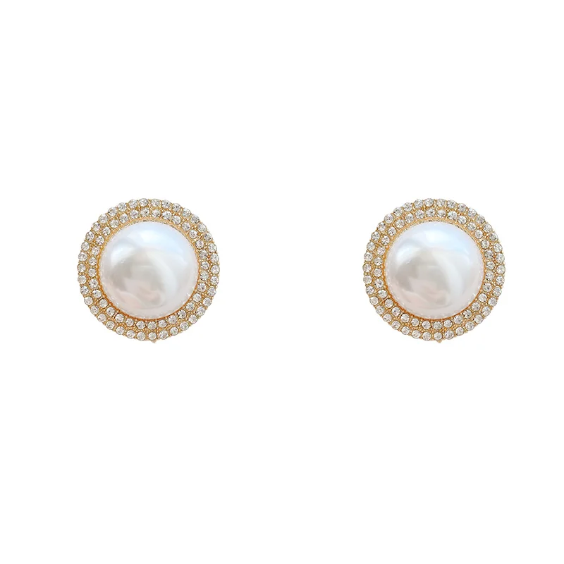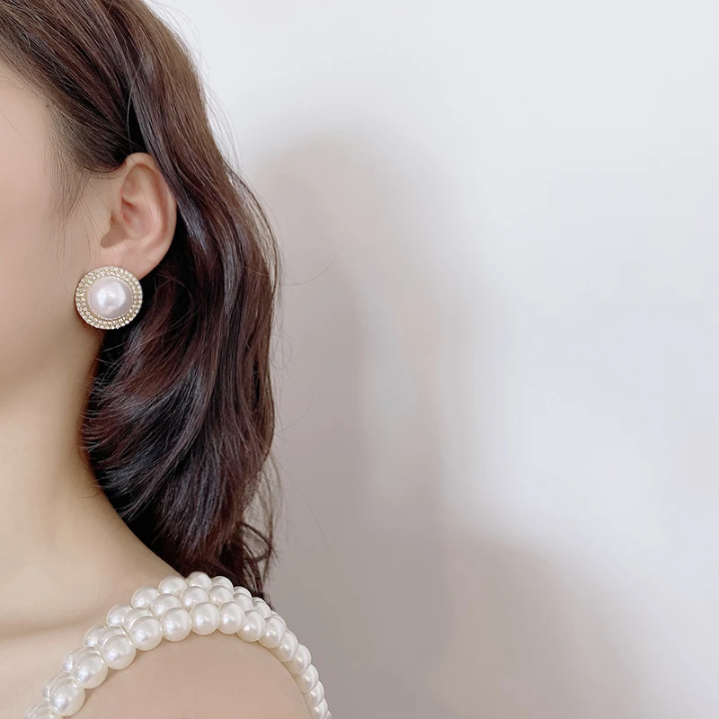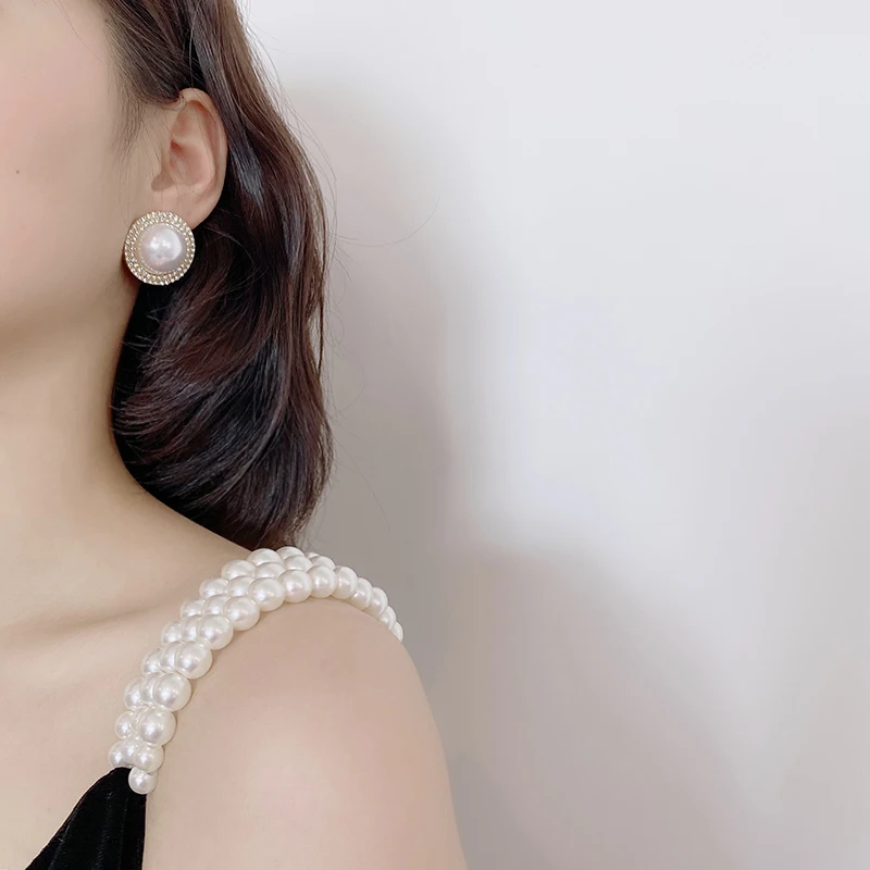 Gold&Silver Color Round Imitation Pearls Stud Earrings for Woman Luxury Crystal Earrings Female Beads Stud Earring