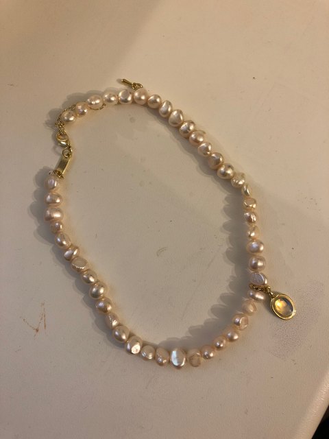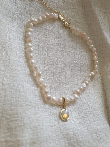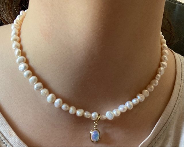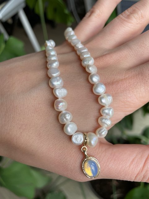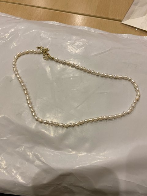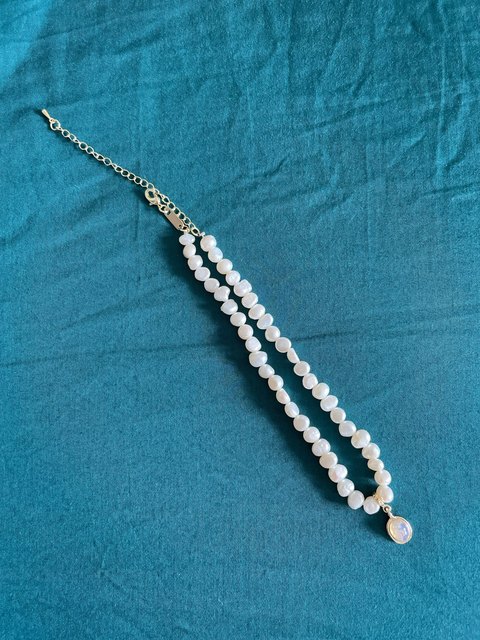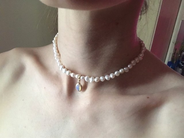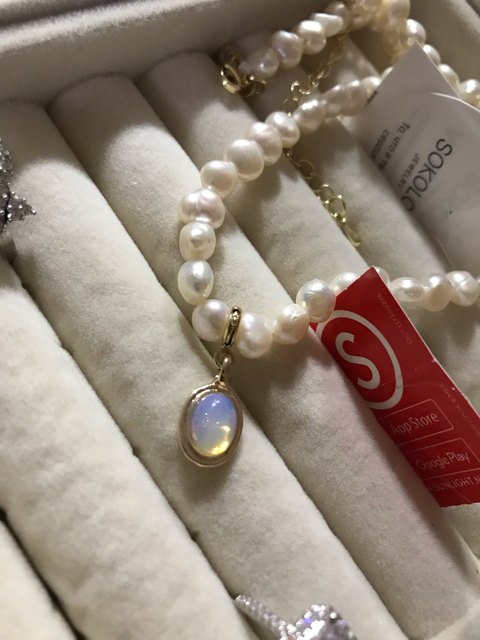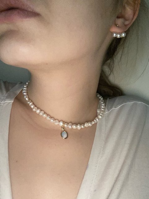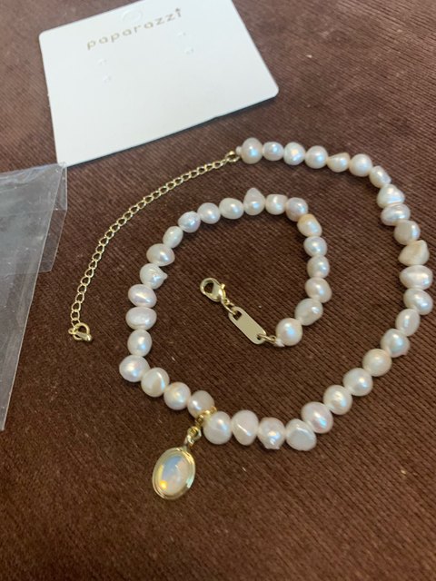 The necklace is beautiful. Pearls are crooked, but I still like it. The stone in the suspension is neat. Looks nice. The clasp is adjustable. It came in a week about to Moscow.