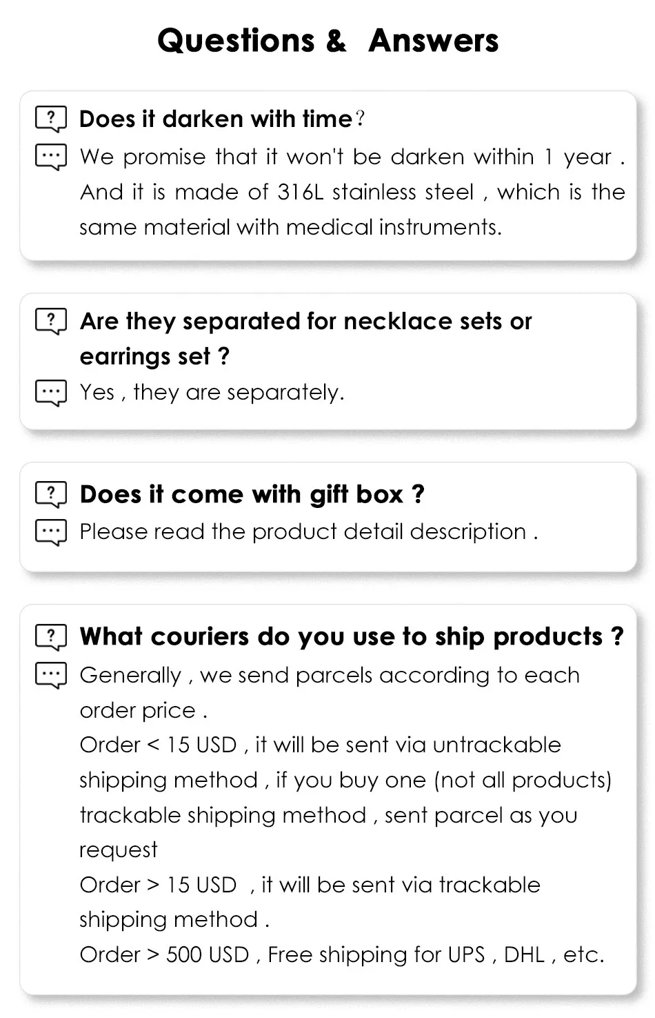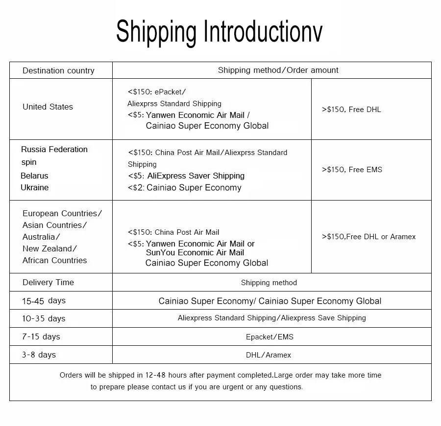 | Shipping | Order > $ 300 Free Shipping UPS DHL EMS |