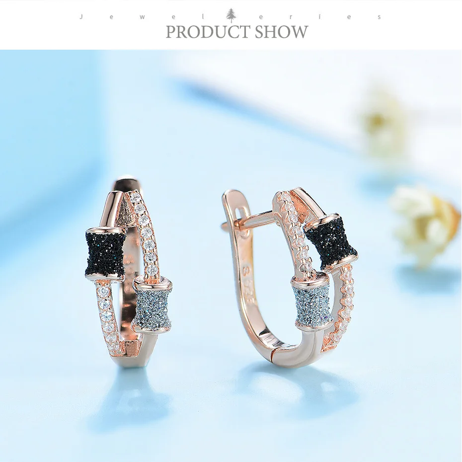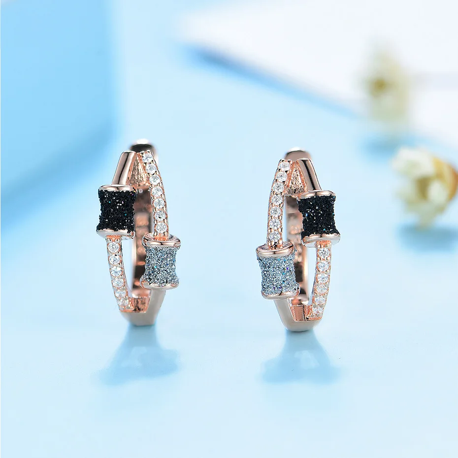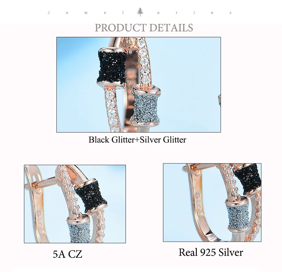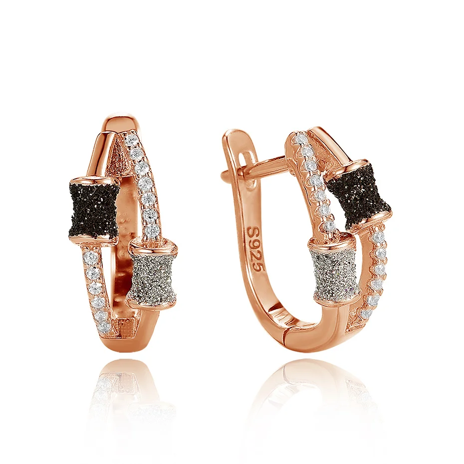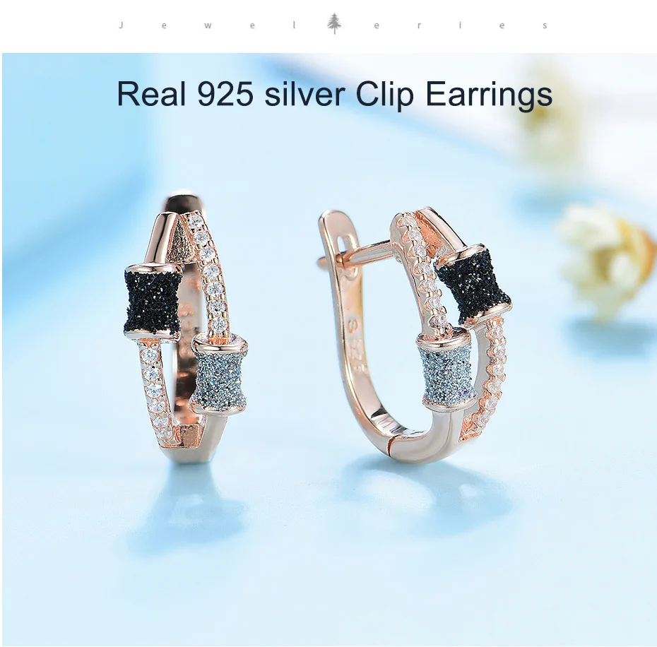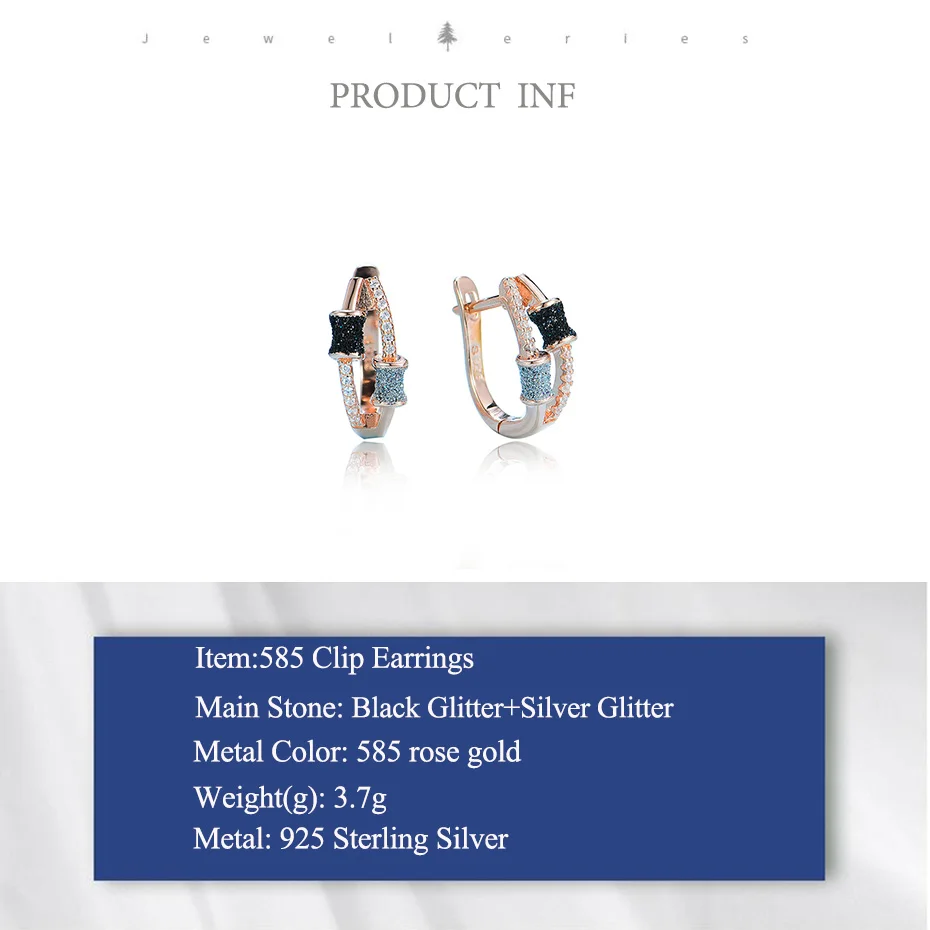 Item: Silver Earrings For Women Earrings :Clip earrings Metal: Solid Sterling Silver Plated: 585 rose gold plated Gemstone: glitter Stone Color: black and silver Stone Cutting: Good Cut Stone Created Method: Created Free velvet jewelry bag