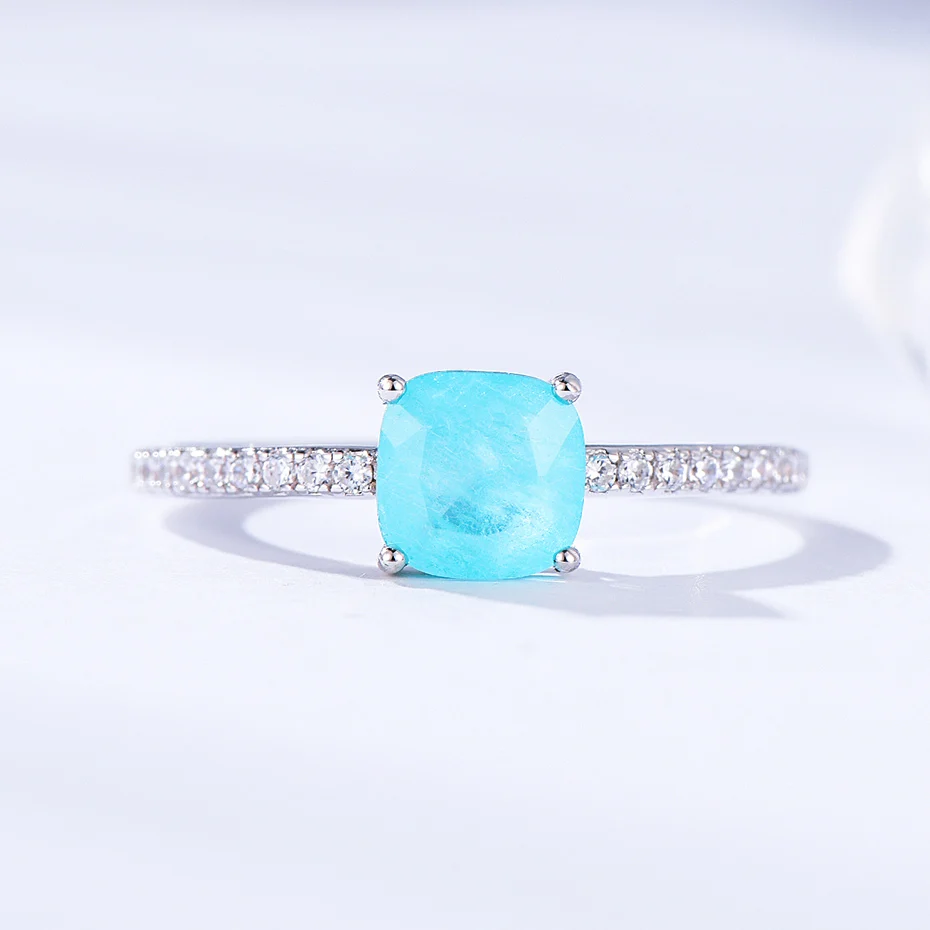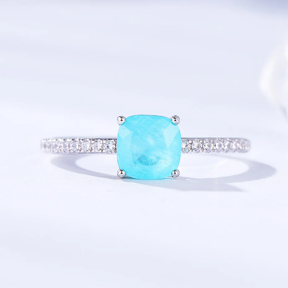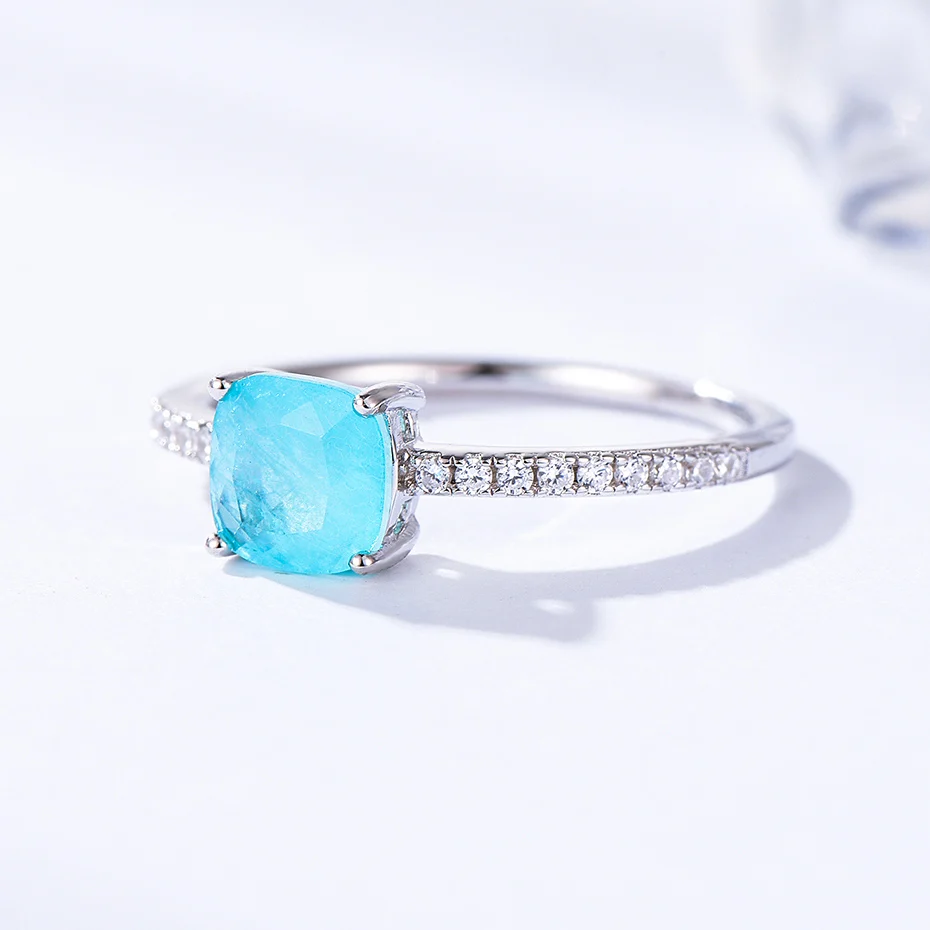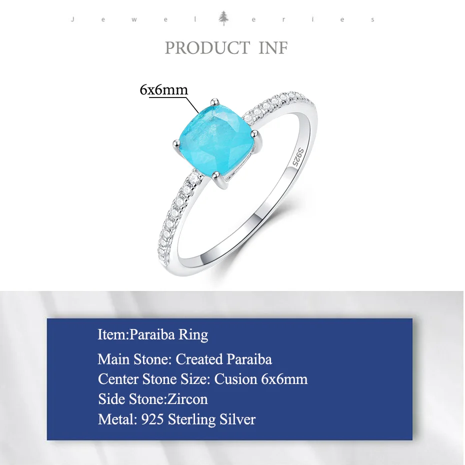 Item: Silver Ring For Women Metal: 925 Solid Sterling Silver Plated: Rhodium Plating Gemstone:Created Paraiba Tourmaline /Emerald/Tanzanite Stone Size:Cusion 6x6mm Ring weight:1.6g Stone Color: Blue Stone Cutting: Good Cut Free velvet jewelry bag