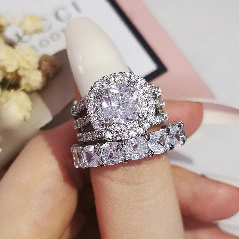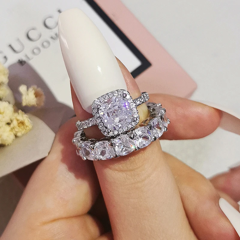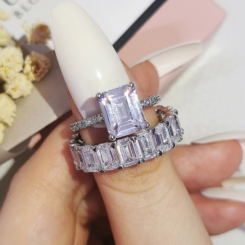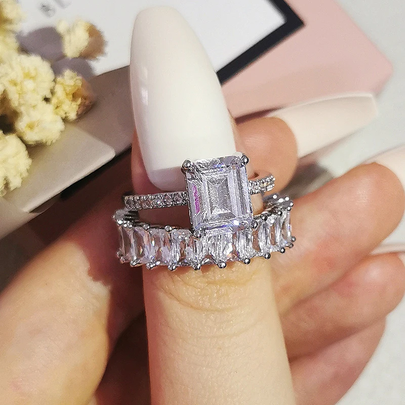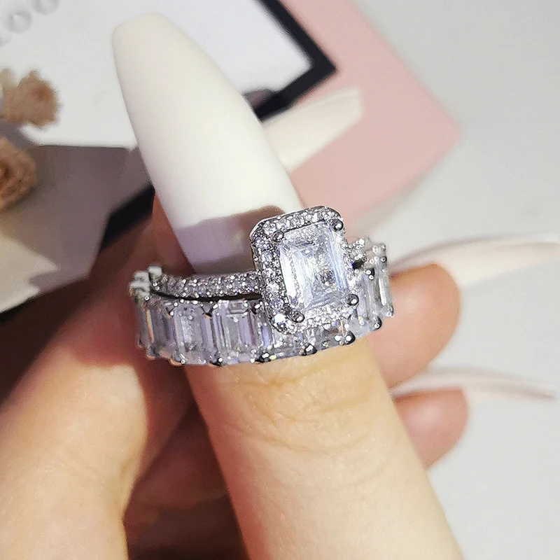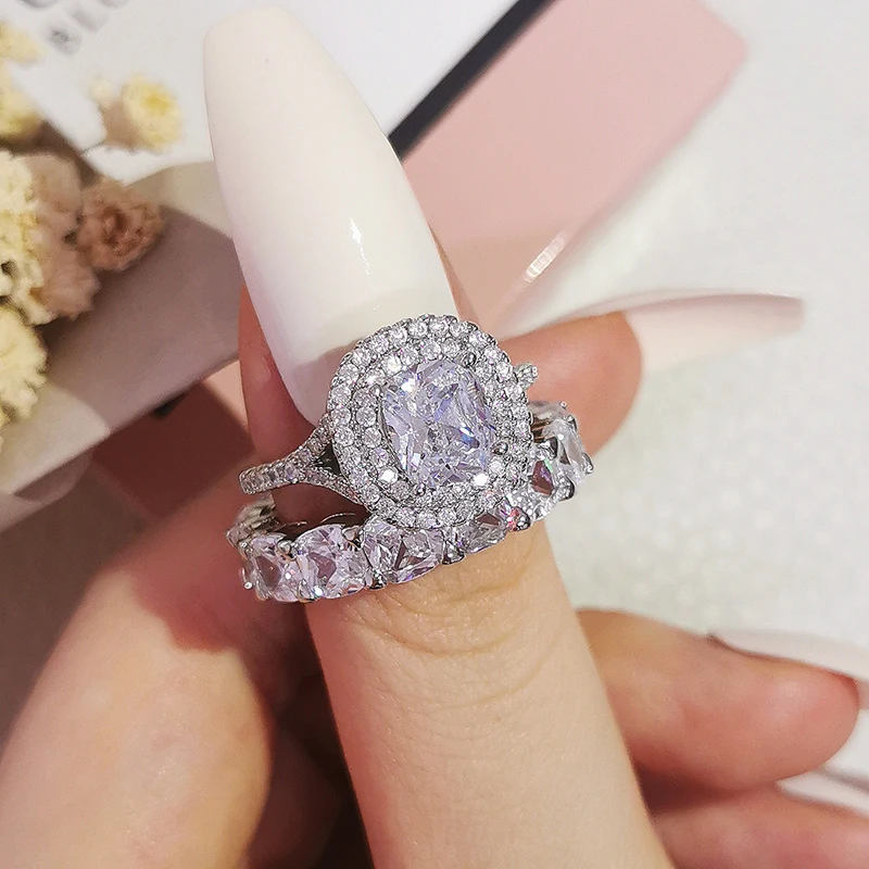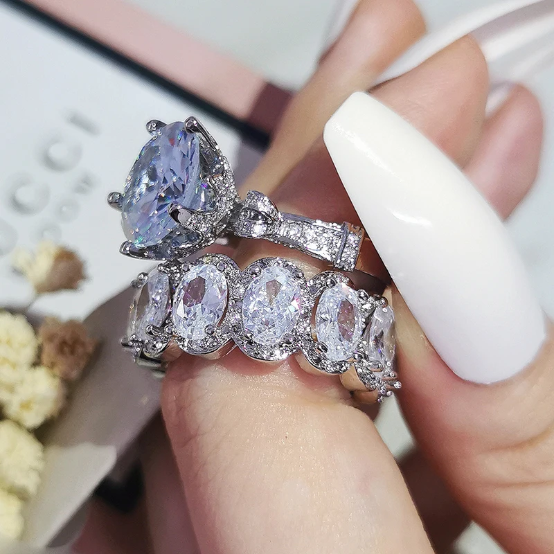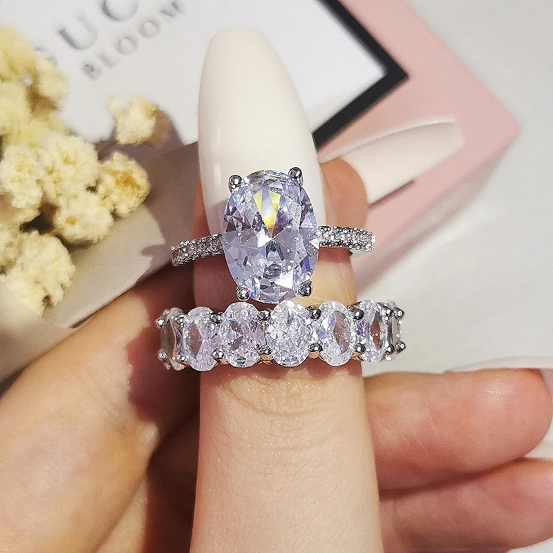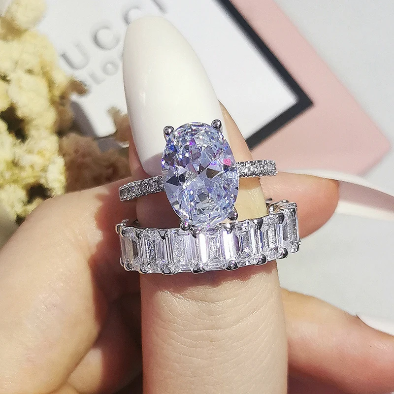 Luxury Real 925 Sterling Silver Oval Princess Cut Wedding Ring Set For Women Engagement Band Eternity Jewelry Zirconia R4975