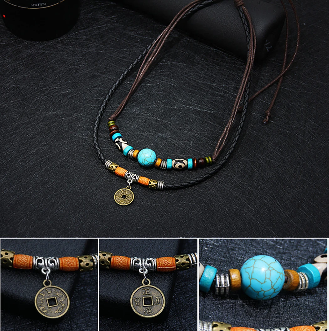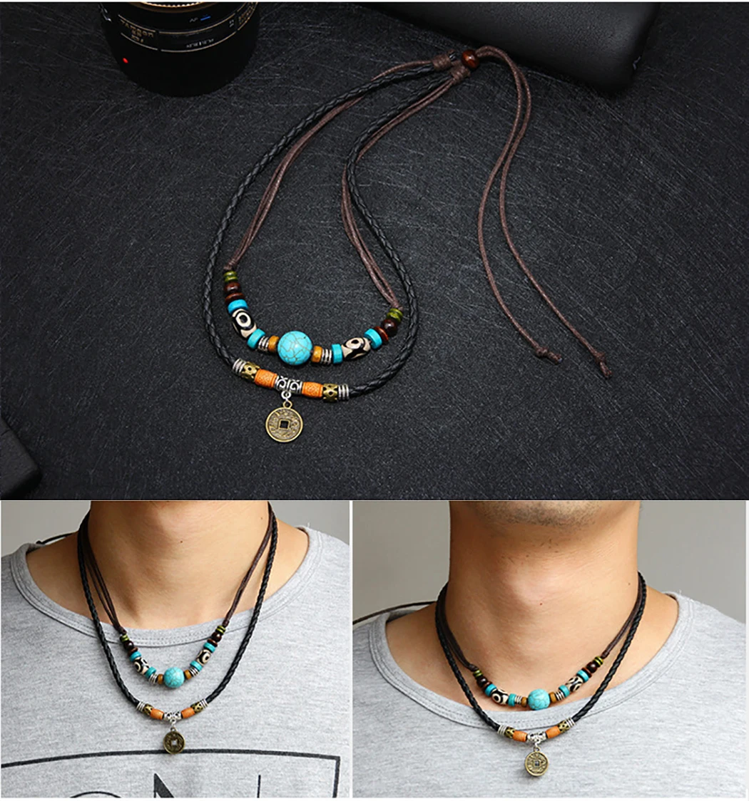 Men 2 layers Leather Rope Necklace Vintage Fashion Retro Creative Coin Decor Layered Pendant Charm Wax Rope Faux Leather