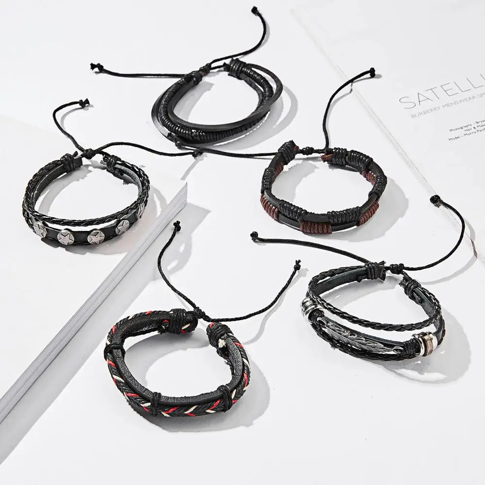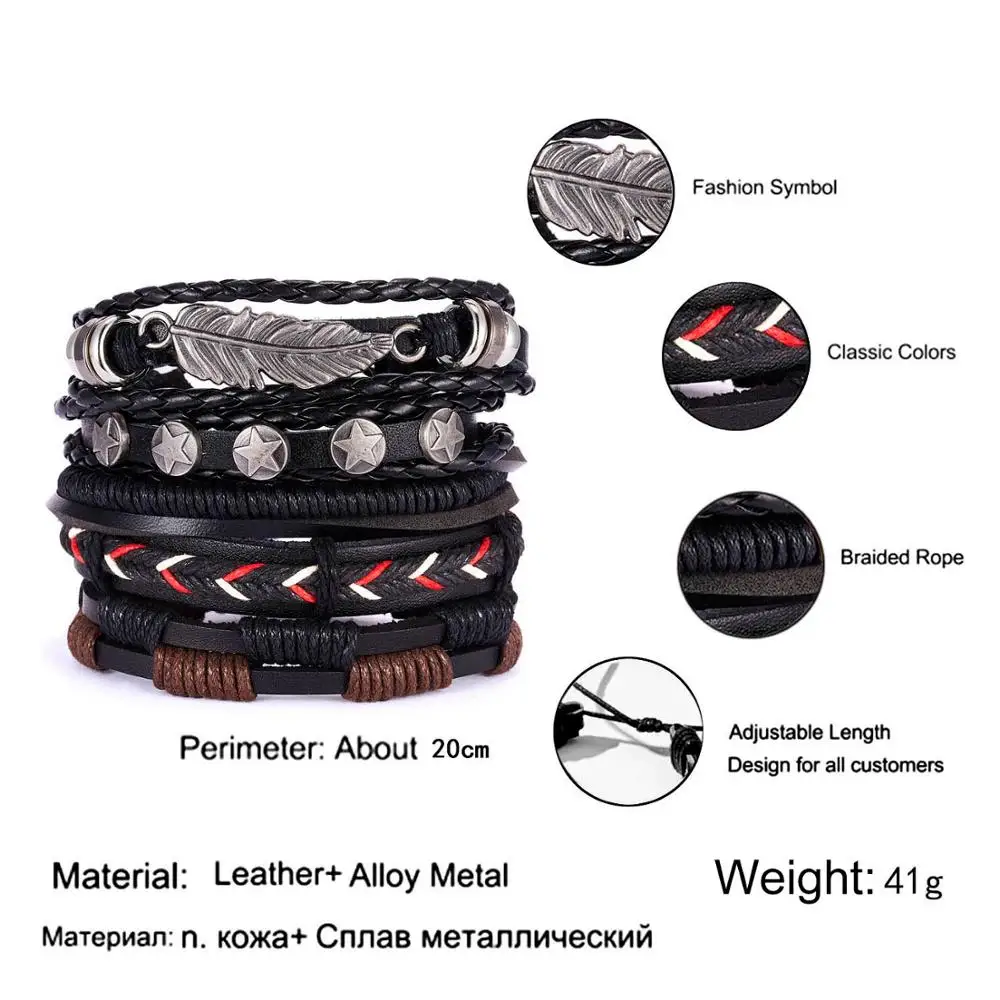 Men Bracelets Vintage Multilayer Feather Braid Bracelets Bangles Star Leaf Owl Handmade Rope Wrap Bracelets Male Gift Jewlery