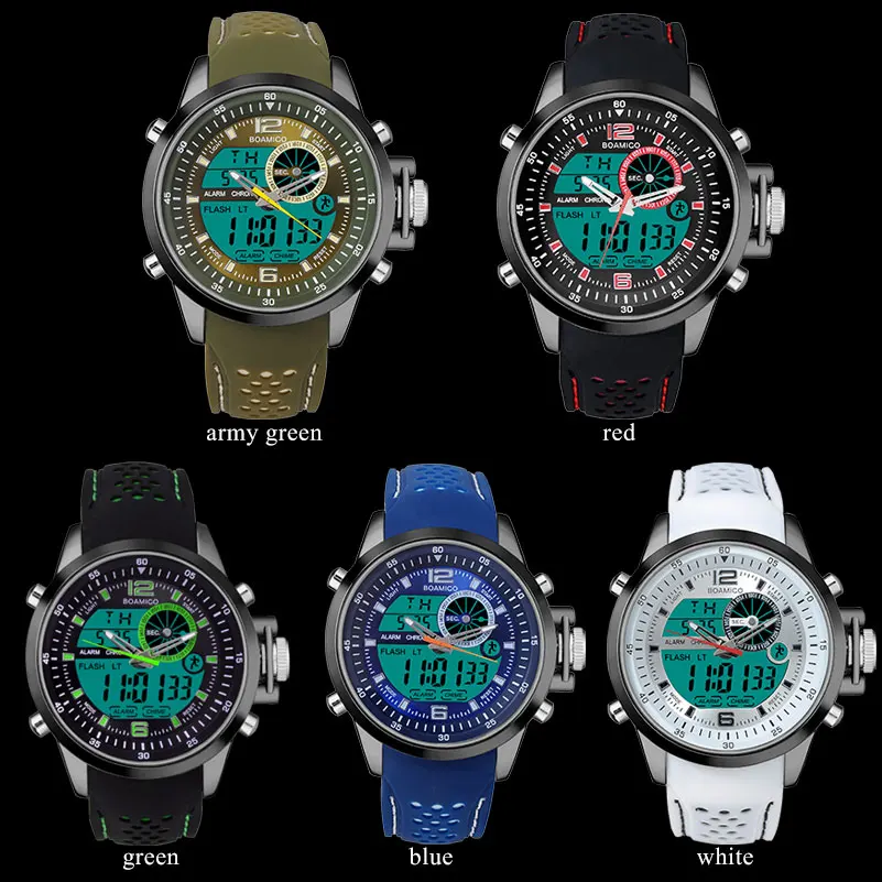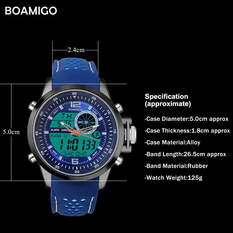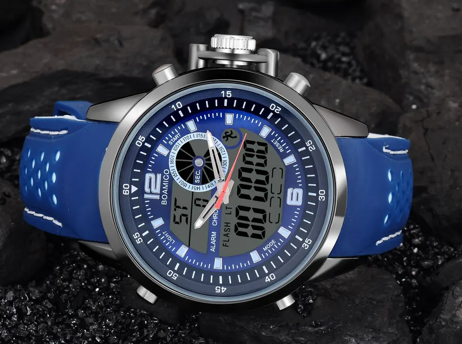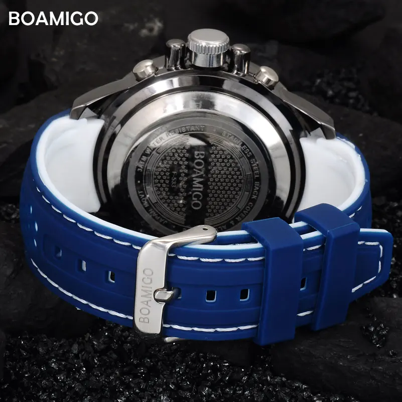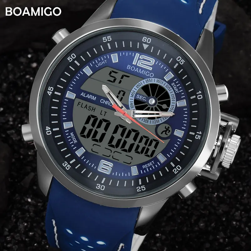 Men Sports Watch Military Quartz Watch Rubber Band BOAMIGO Brand Blue LED Analog Digital Wristwatch 30M Waterproof Reloj Hombre