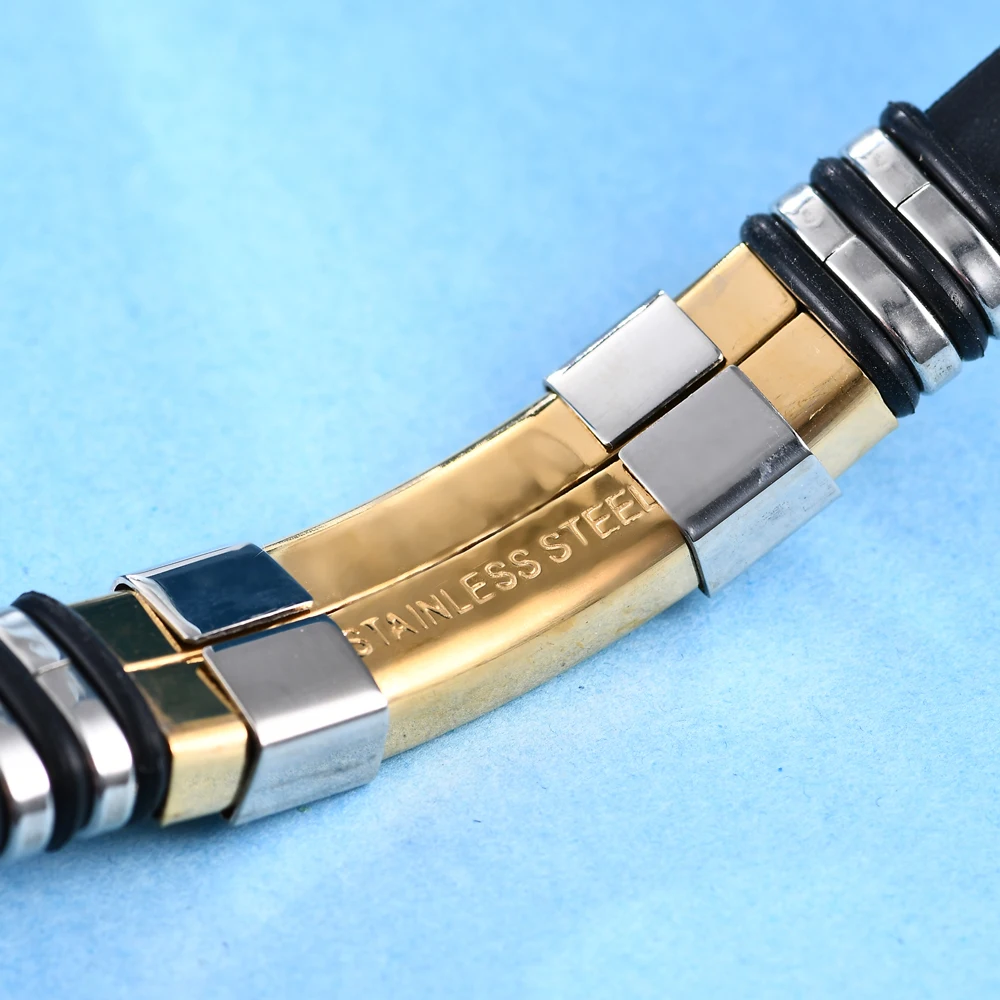 Men Wrist Band Bracelet With Black Grooved Rudder Silicone Mesh Link Insert Punk Wristband stainless Steel Stylish Casual Bangle