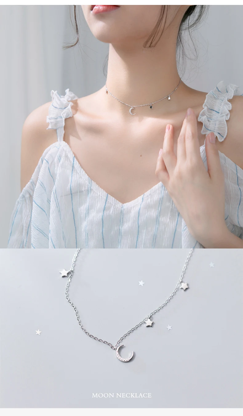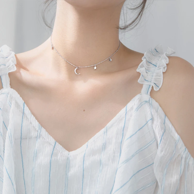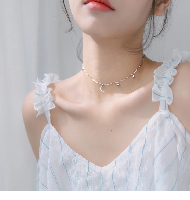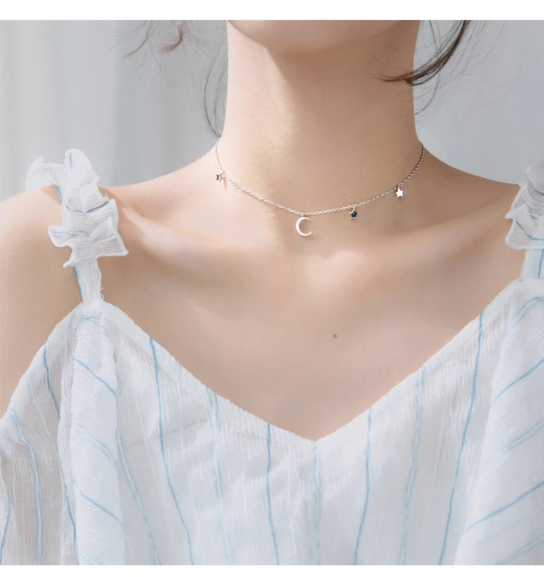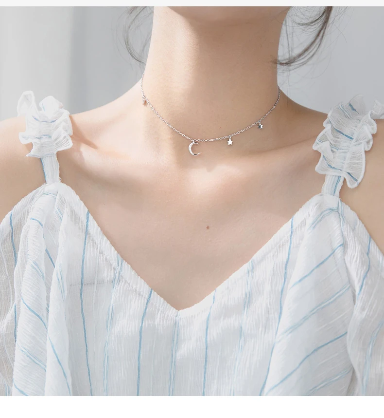 Real 925 Sterling Silver Choker Necklace Tiny Rose Gold Color Moon Star Charm Pendant cz Paved for Women Friends Engagement