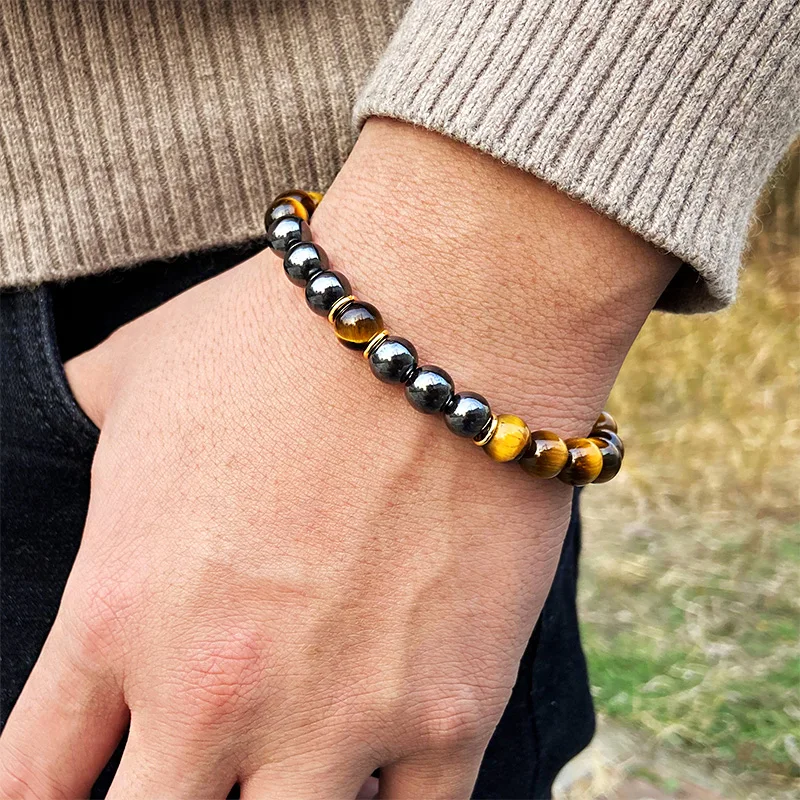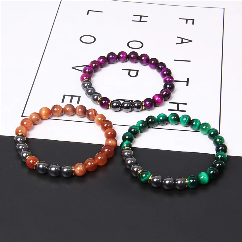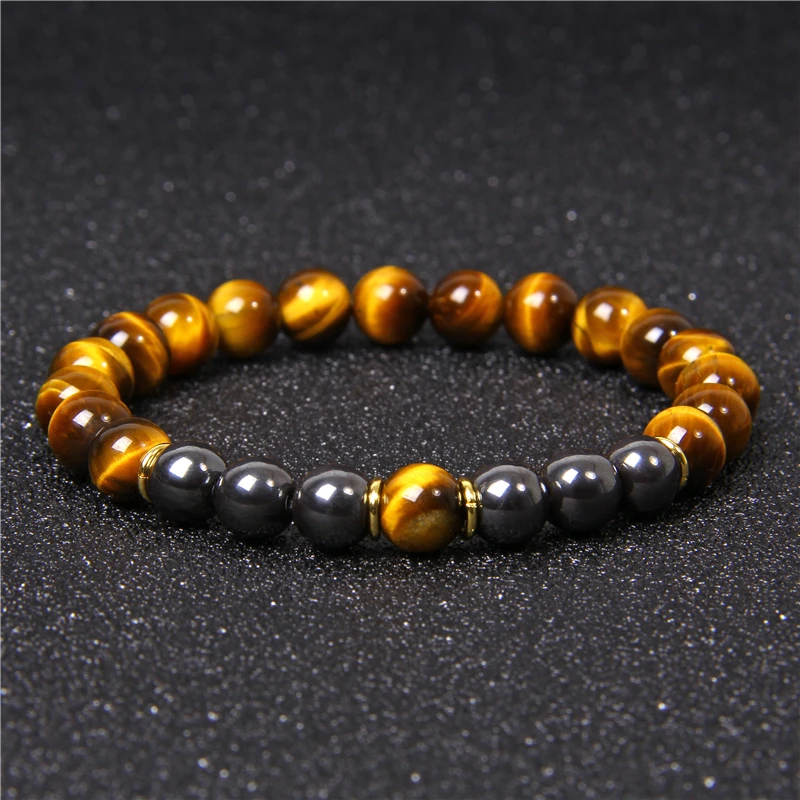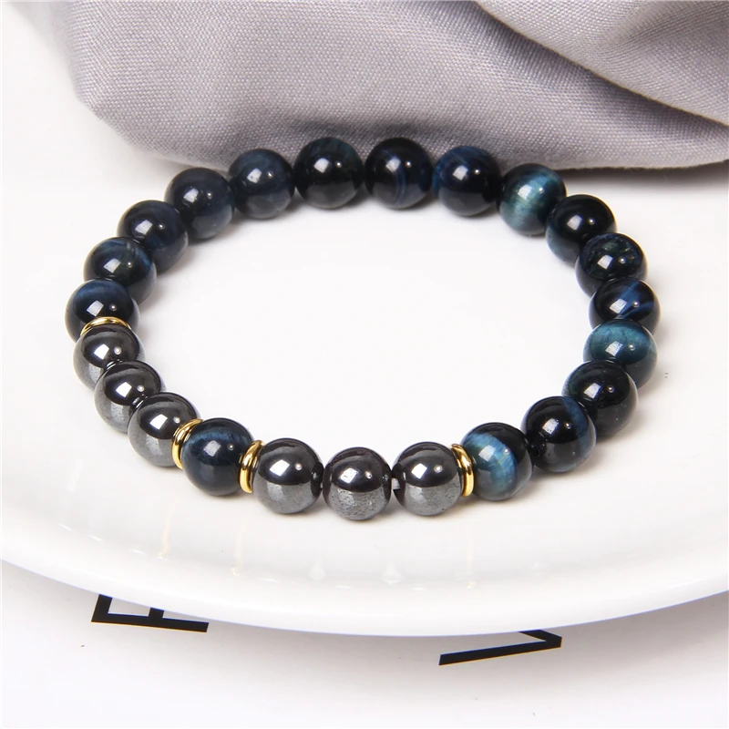 Natural Polished Blue Tiger Eye Stone Bracelets For Women Men Fashion Classic Elastic Hematite Bracelets Femme Bangle Jewelry