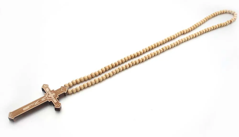 New Boy Large Wood Catholic Jesus Cross With Wooden Bead Carved Rosary Pendant Long Collier Statement Necklace Men Jewelry
