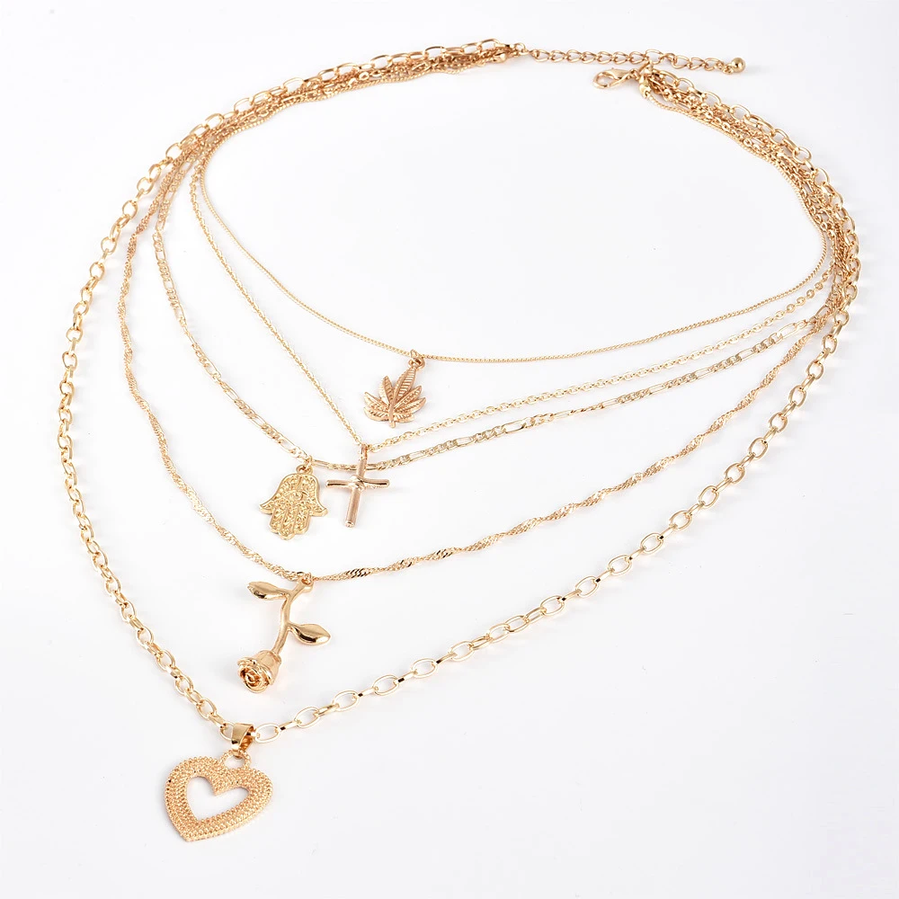 New Fashion Multi layer Flower Leaf palm Cross Heart Shape Necklaces & Pendants For Women Trendy Charm Gold Necklace Jewelry
