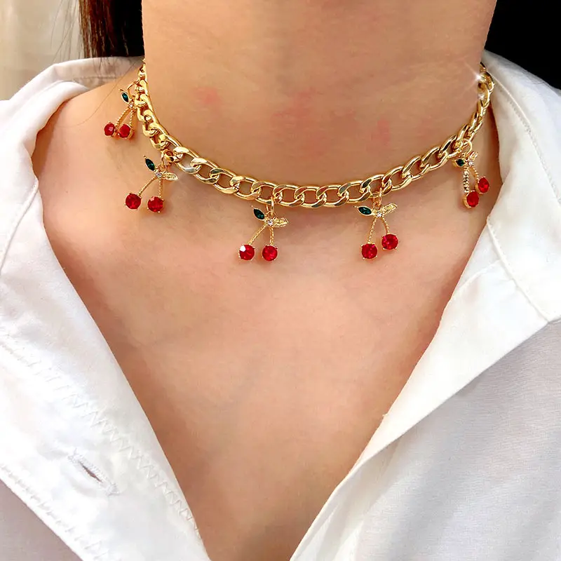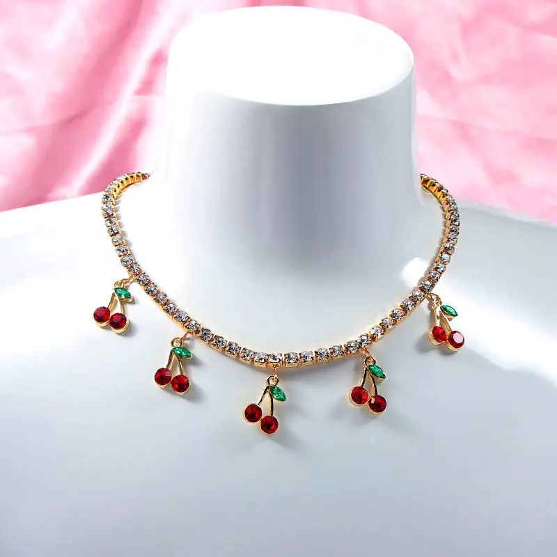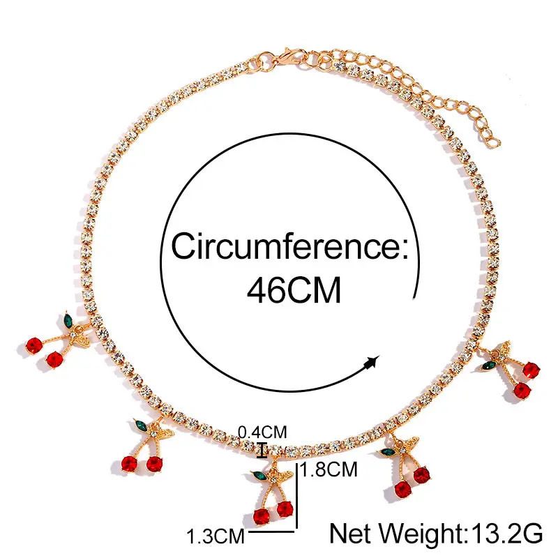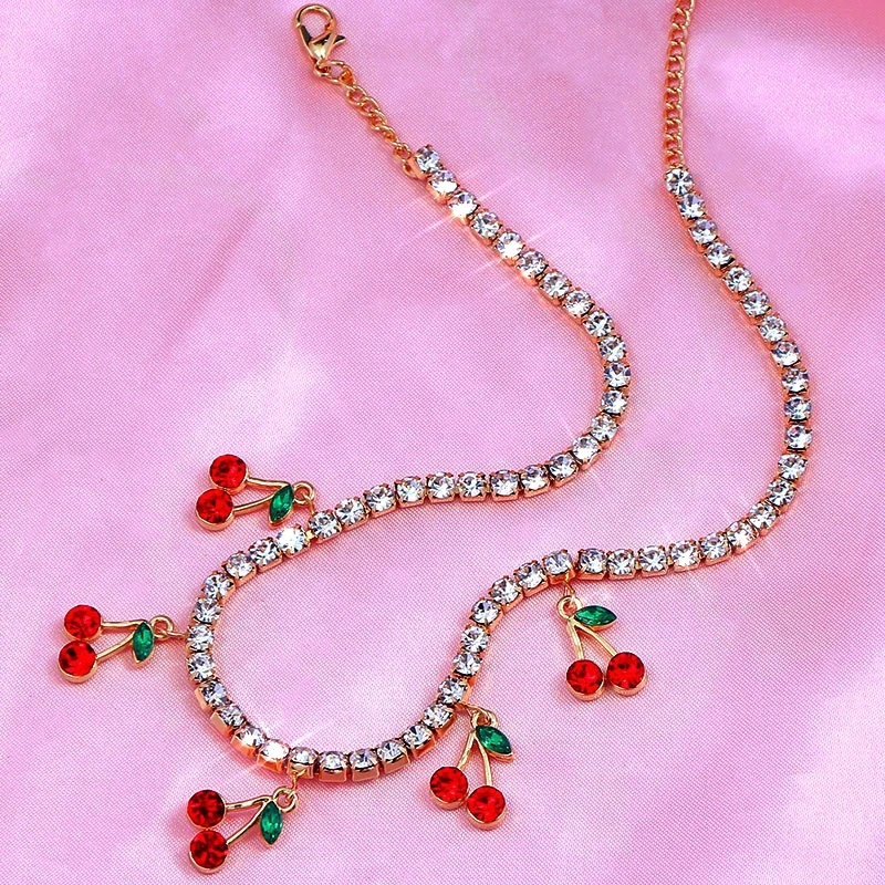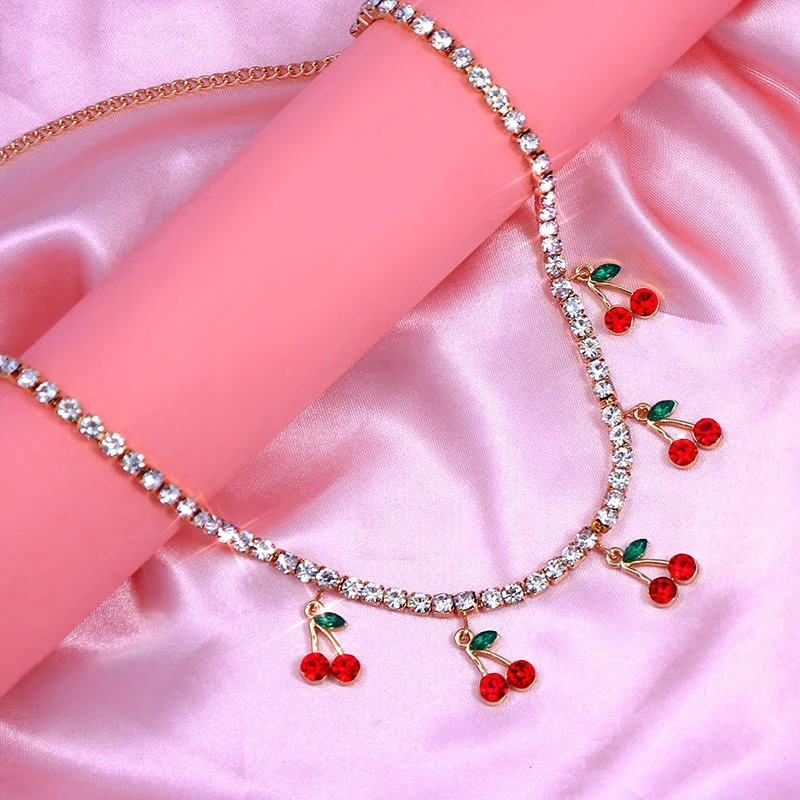 New Korean Fashion Red Cherry Crystal Pendant Necklace for Women Bling Rhinestone Tennis Chain Necklace Luxury Jewelry Gift