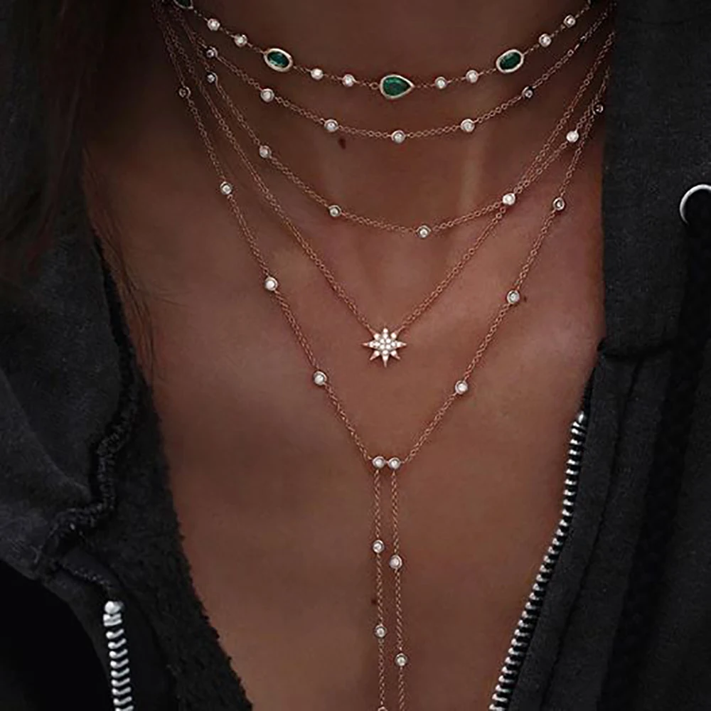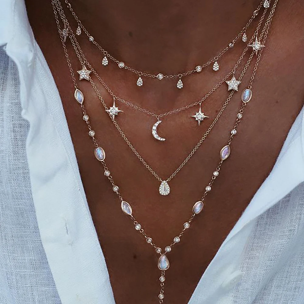 New Vintage Crystal Geometry Star Moon Lock Necklace For Women 2020 Boho Multi-level Pendants Necklaces Chokers Jewelry Gift