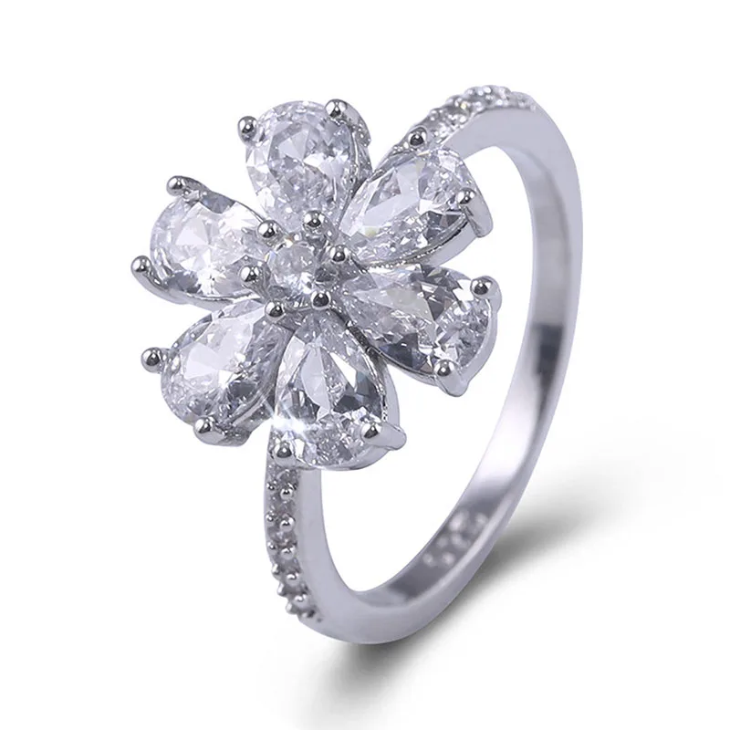 Ofertas Shiny Flower Shaped Inlaid White Crystal Zirconium Silver Color Alloy Ring for Women Wedding Party Jewelry Accessories
