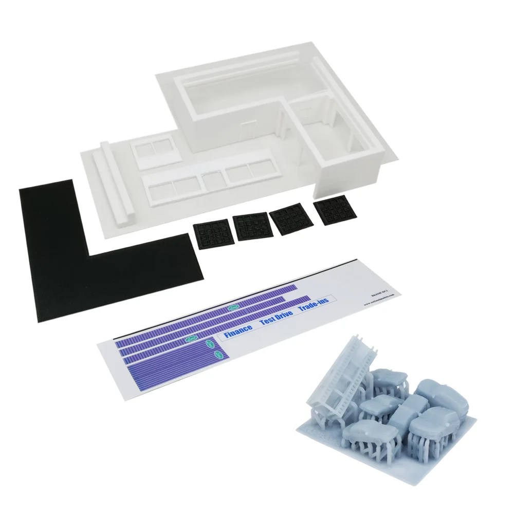 This product is created by a 3D printer, it is unpainted in its original color as pictured, some parts may require assembly by using glue. Printing patterns on the surface could be visible if you look at it carefully. For technical and safe transporting reason, some parts may come with a very thin sheet below it or a support structure which connects to it on some points (please check the last picture), You may have to remove the product with a cutter(just like you remove the parts from a sprue in a model kit). Materials: PLA & Resin, Scale: N Scale/1:160, Dimensions: 85mm x 87mm x 51mm(H) This kit includes: Car dealership building, all details accessories as pictured, a decal sheet(cutting required), a clear plastic sheet(used as ‘glass’, cutting required)