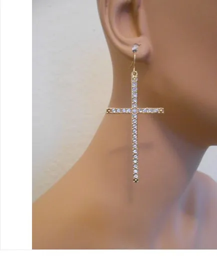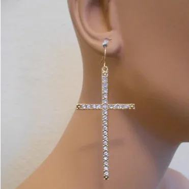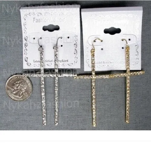 Hip Hop Big Gold/Silver Plated Rhinestone Cross Dangle Earrings Fashion Crystal Cross Earrings