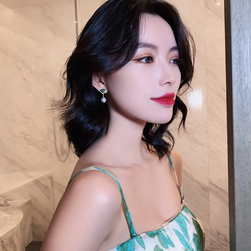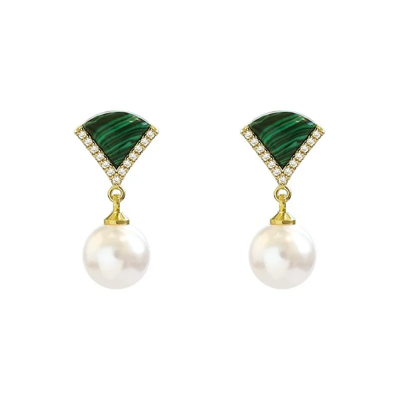 Premium Texture Fan-shaped Malachite Fresh Eardrop Light Luxury Elegant Simulated-pearl Pendant Earrings Woman Bijoux