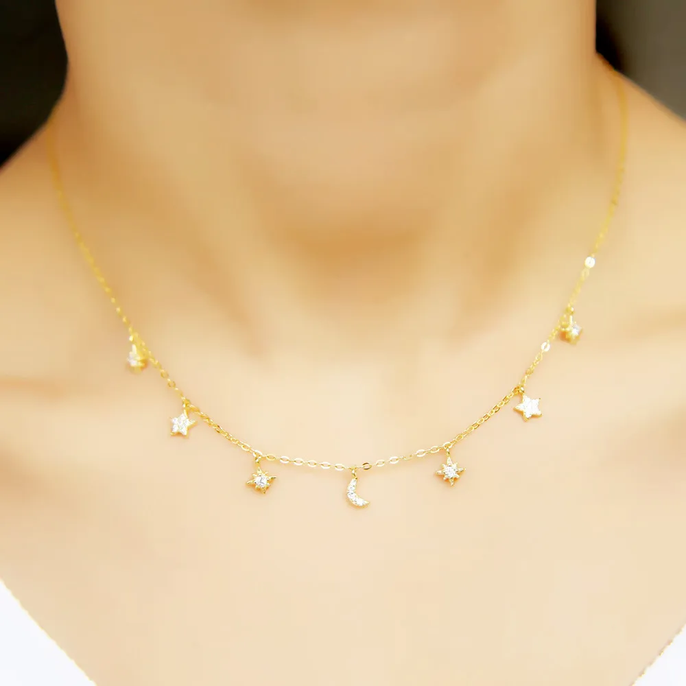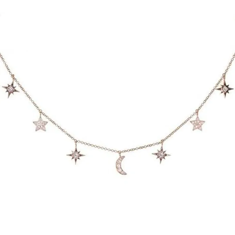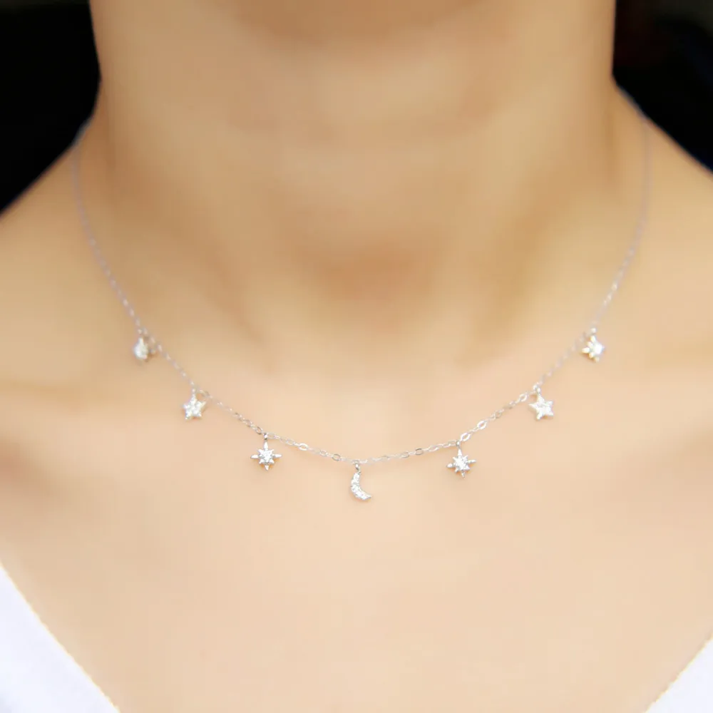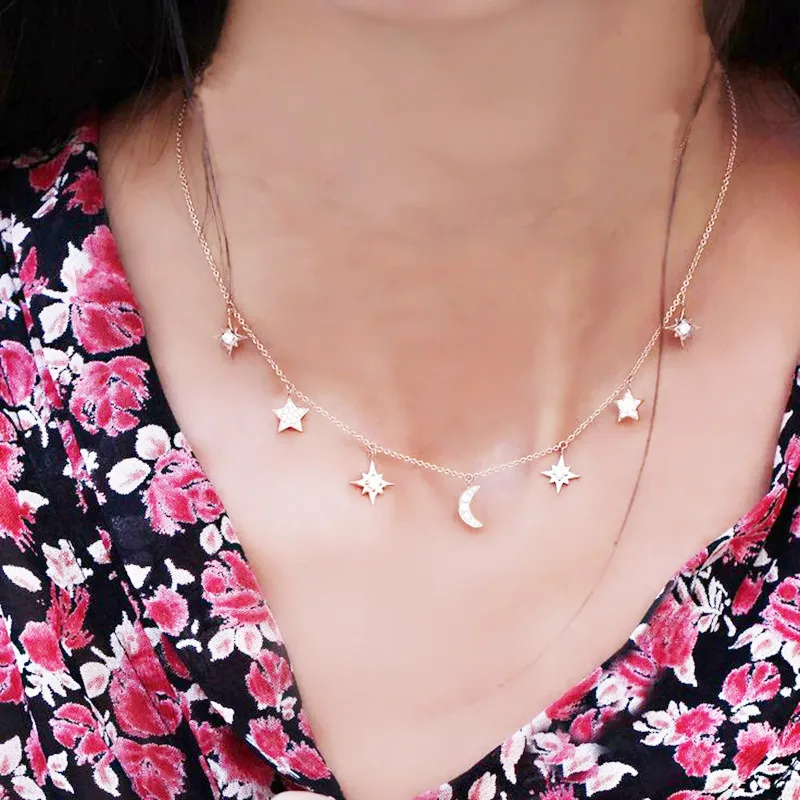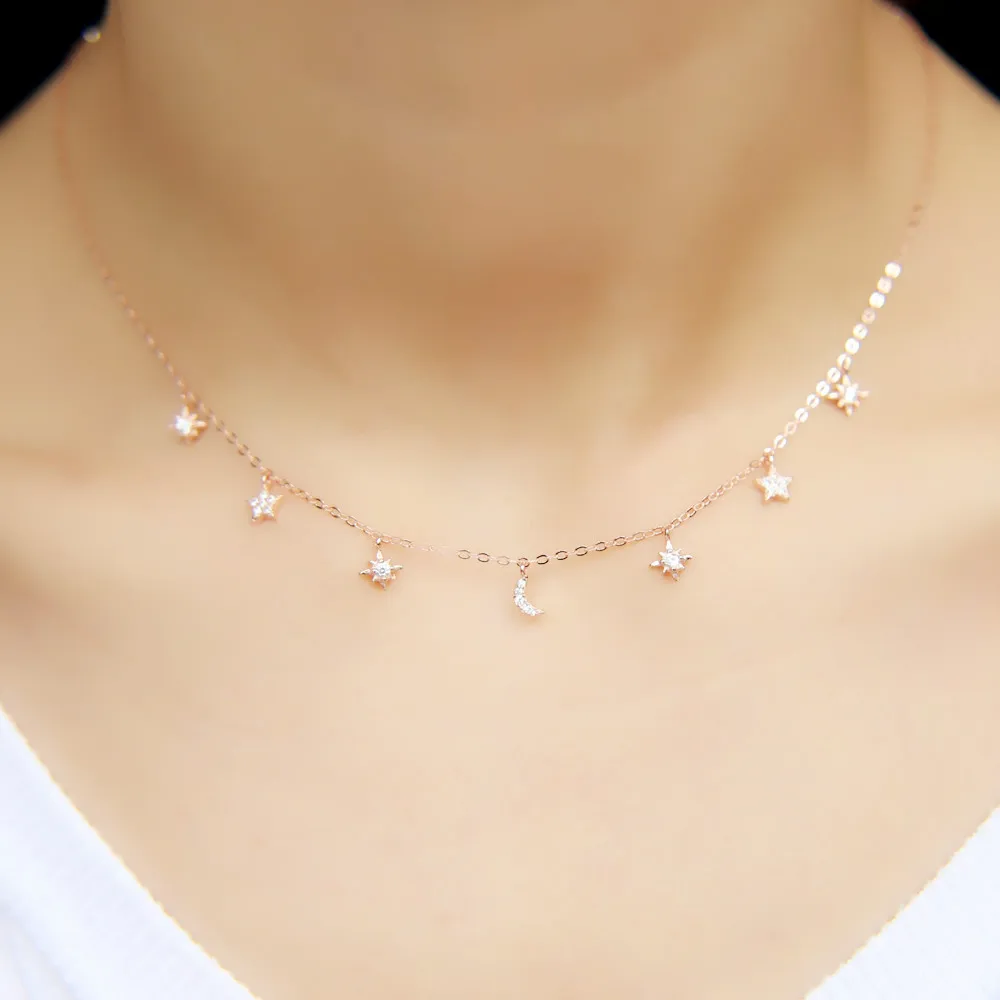 Real 925 Sterling Silver Choker Necklace Tiny Rose Gold Color Moon Star Charm Pendant cz Paved for Women Friends Engagement