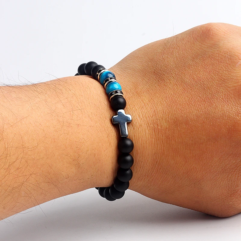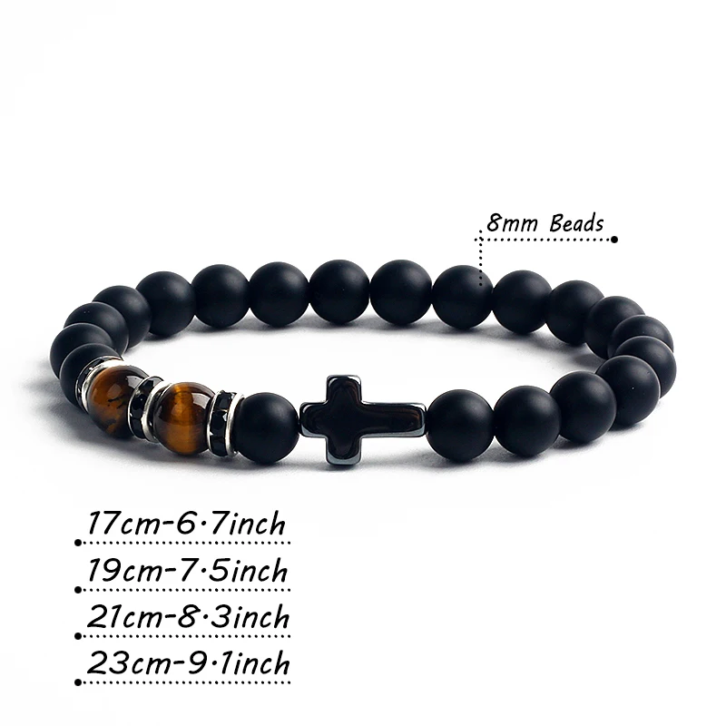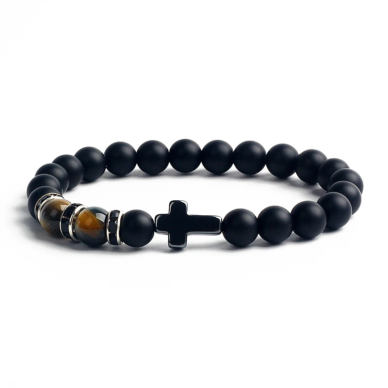 Religion Christian Cross Bracelets Men Fashion Reiki Tiger Eye Black Matte Agates Bead Bracelet Nature Stone Catholicism Jewelry