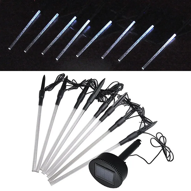 Solar panel power: 2V Solar panel diameter: 83mm Total height: 385mm Length of cable: 10m Distance between lights: 1.2m Material: plastic DIY installation – no wiring required Battery: 1 x AA 1200mAh 1.2V Ni-Mh LED: 8pcs white LED Auto sensor turns on when dark Advantages: 1.Decorative acrylic bubble sticks look fantastic and really add some personality to your garden. 2.The light is created by a white LED in each stick that illuminates the bubble effect with eye-catching results. 3.These lights look outstanding in borders or marking out pathways and patios. 4.They’re solar powered (batteries Inc) and so will charge in the daytime and turn on automatically in the evening when the sun goes down.