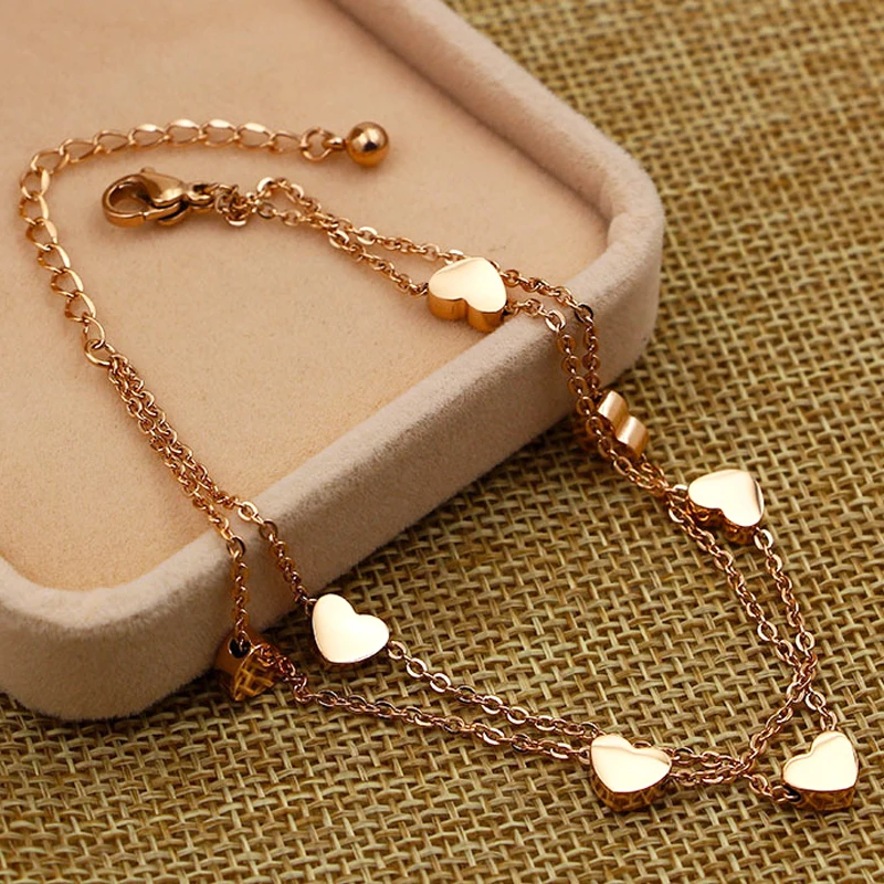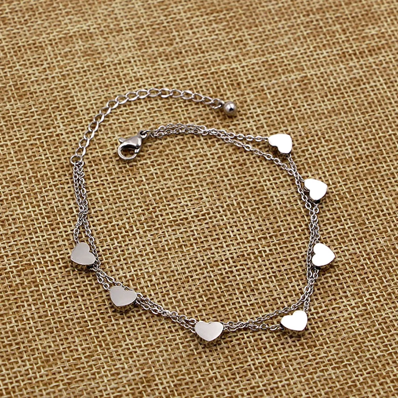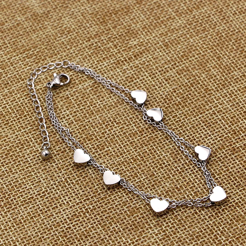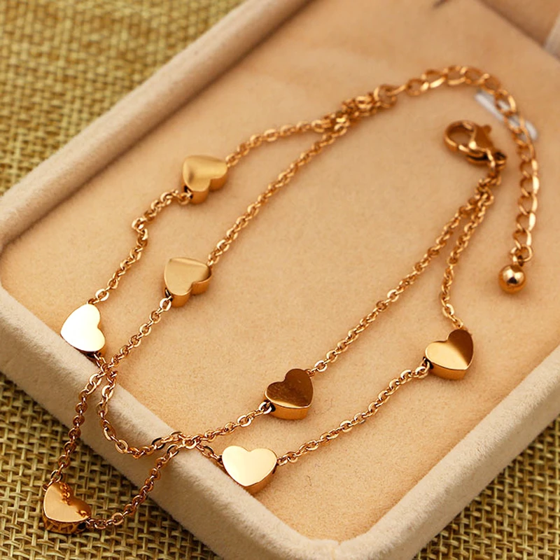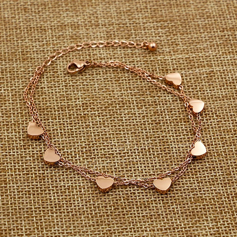 Super Lovely Seven Hearts Rose Gold Double Chain Anklet Titanium Steel Anti Allergic Anklet Jewelry Woman Kid Best Gift
