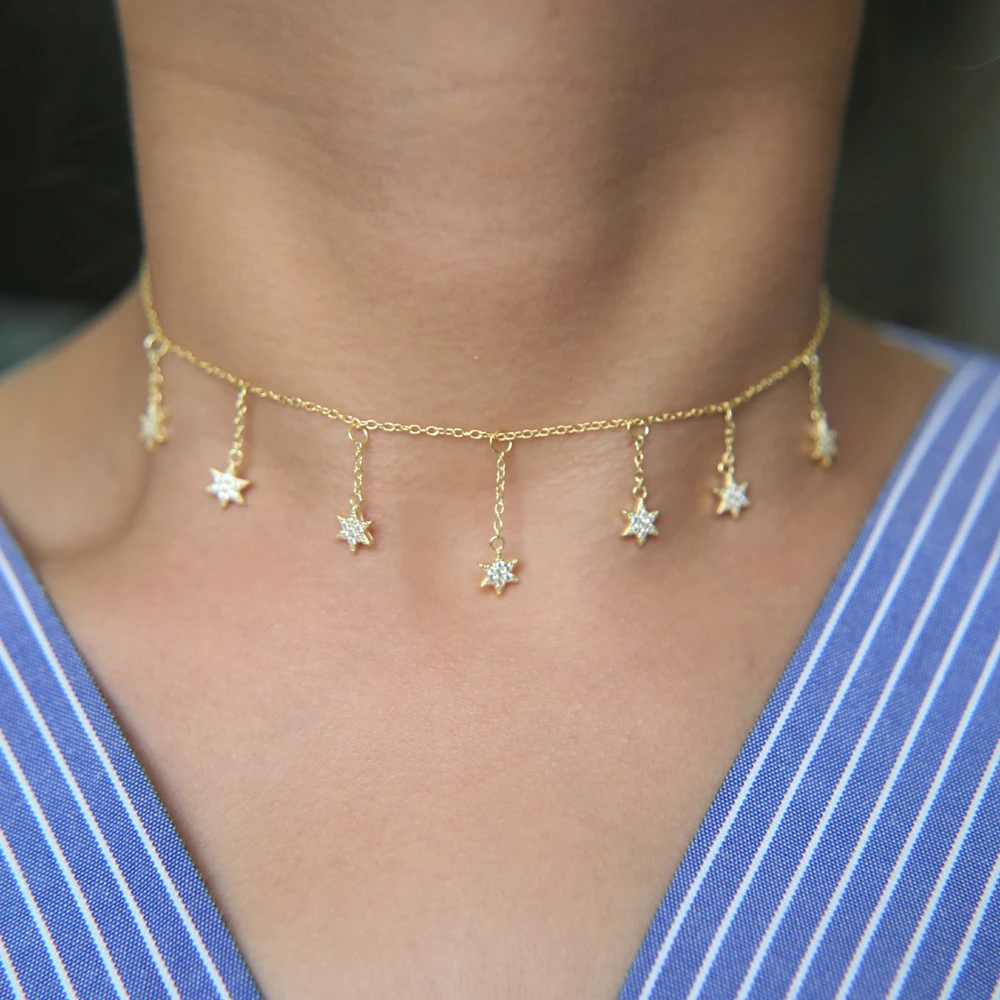 100% 925 sterling silver cz paved station chian with tiny star charm women necklace with 3 color 33+7cm elegance choker jewelry