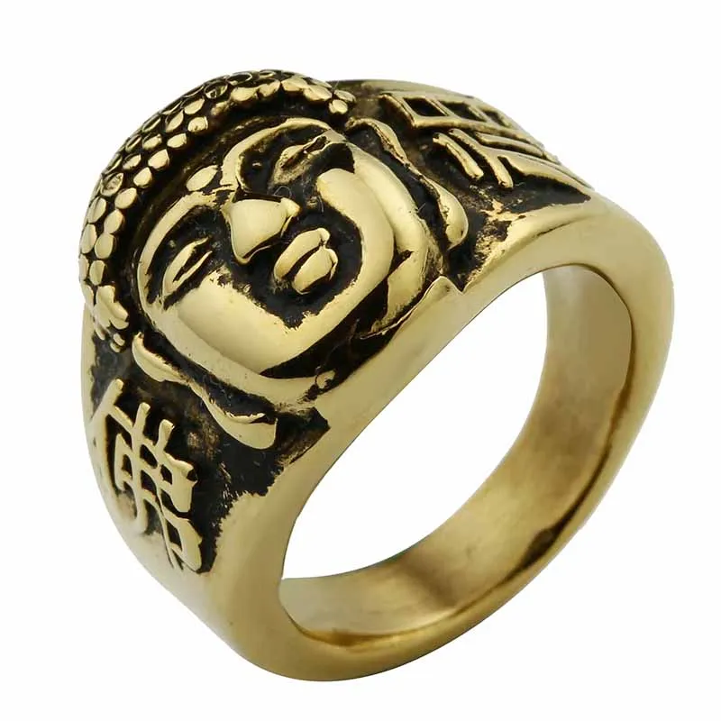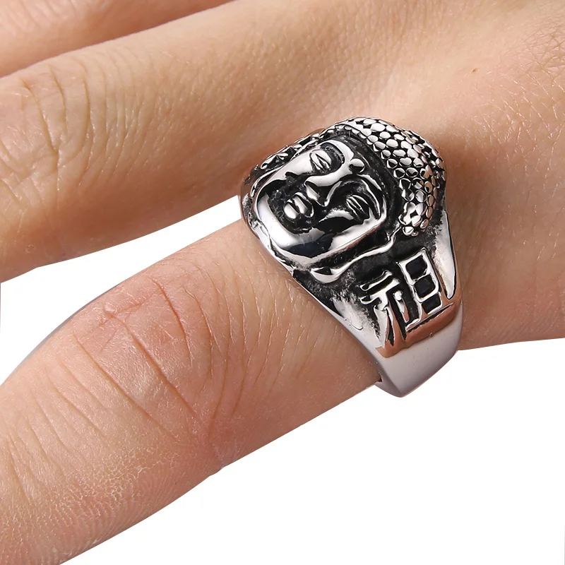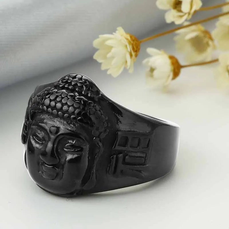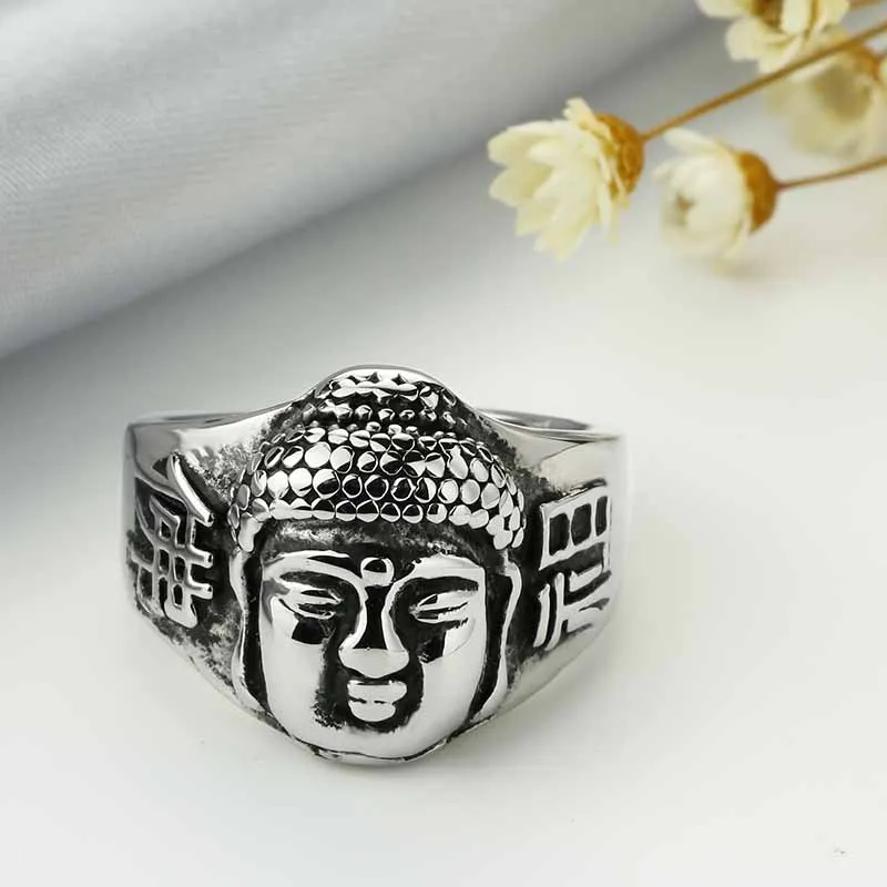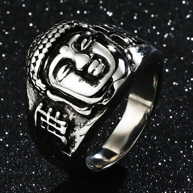 Valily Jewelry Men’s Buddhism Ring Buddha Head Bless Ring Stainless Steel Fashion Silver Black Rings Band for Men US Size