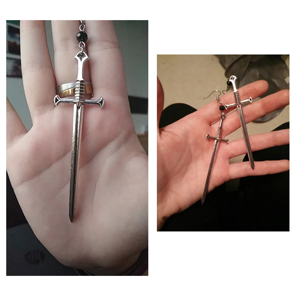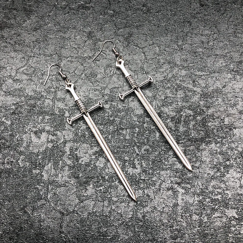 Item details Handmade A stunning pair of antique silver 3d sword earrings with added black glass crystal beads on antique silver earring hooks. Lead and nickel free Earring size can be seen in the second picture, they measure approx 3.2 inches long with hook.