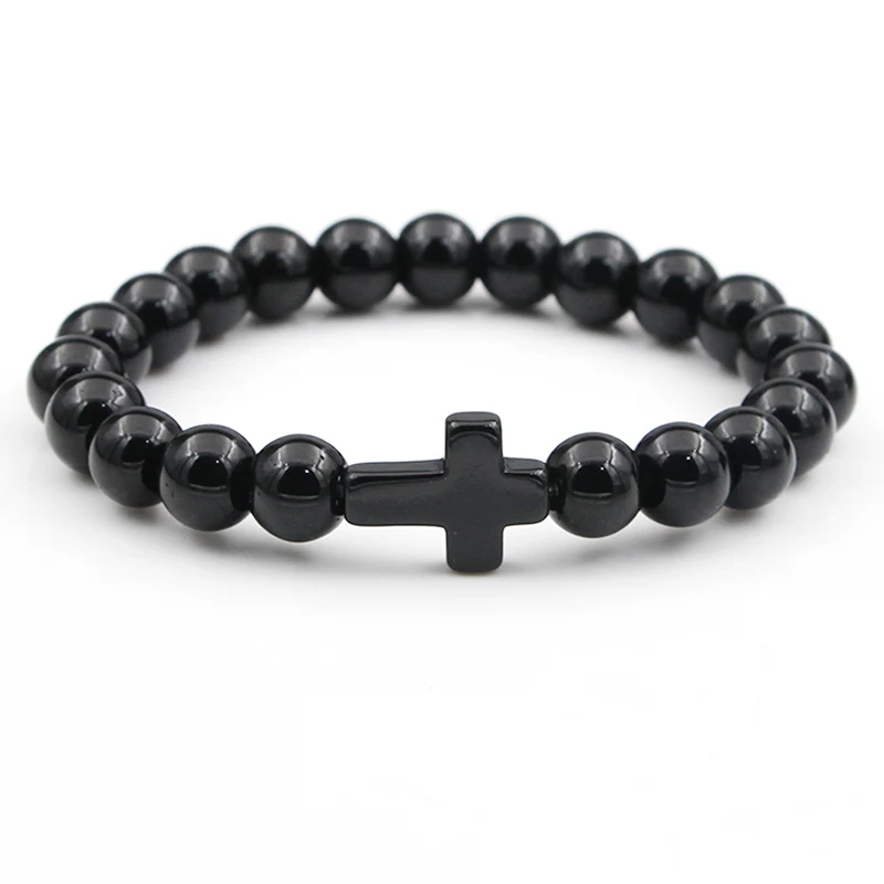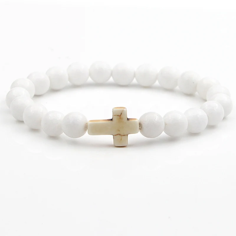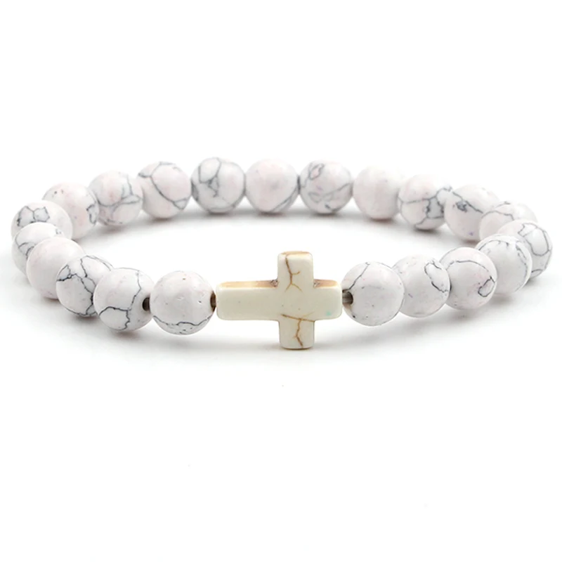 VILLWICE Handmade Natural Stone Cross Bracelet Charm Beaded Elastic Bracelets Men Women Christian Jewelry Gifts 12 Colors