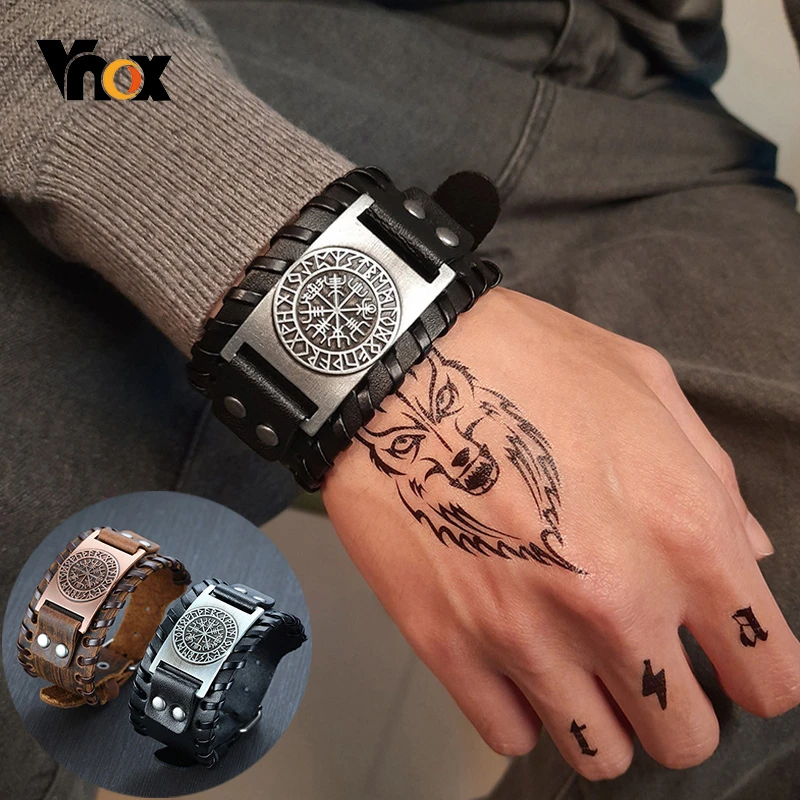 Vnox Men’s Stylish Viking Leather Wrap Bracelets Rock Punk Compass Charm Male Wrist Jewelry Length Adjustable