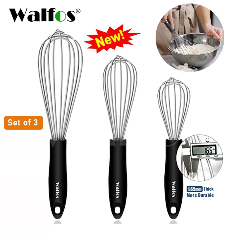 ✔ 1.65 MM THICKENED WIRE, STRONG THAN OTHERS – STRONG & DURABLE: Walfos kitchen whisk is made of 1.65 mm Food Grade Stainless Steel, strong than others(1mm), never get rusty. Ergonomically designed for excellent balance and control. Popular balloon shape for optimal whipping.