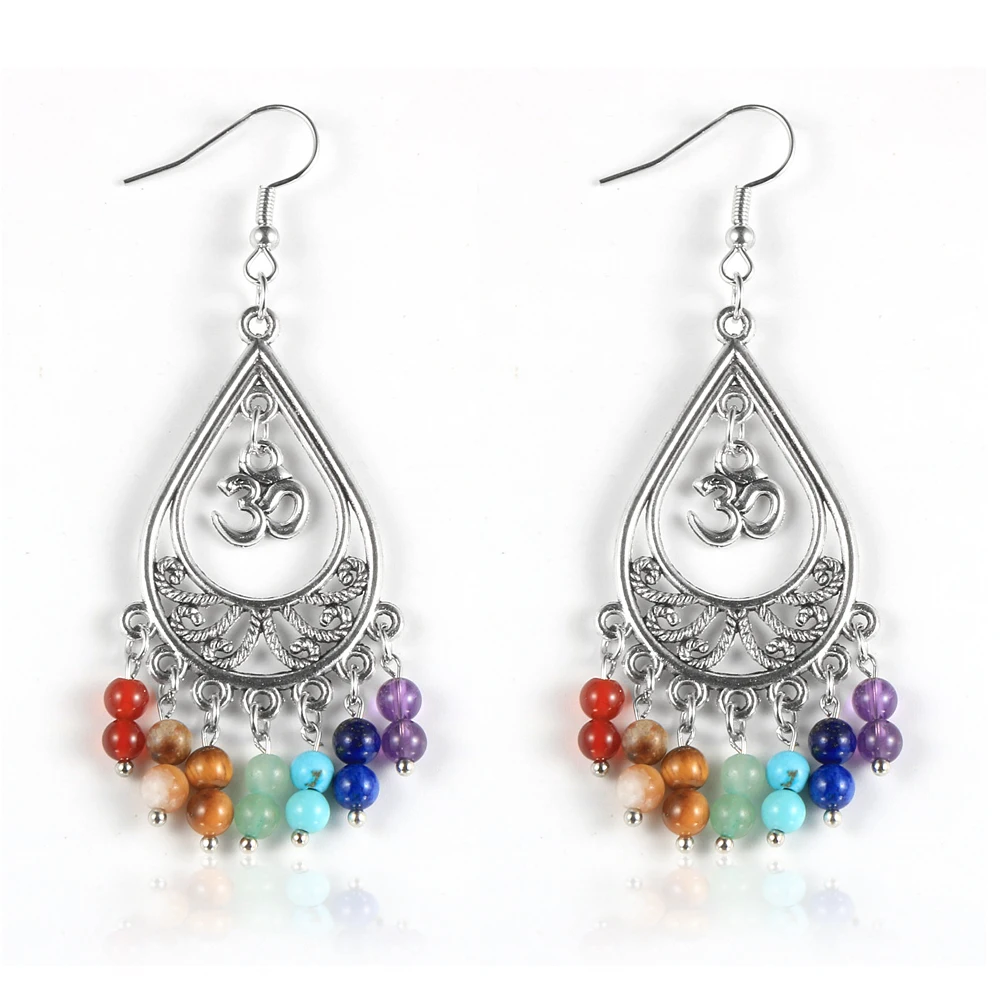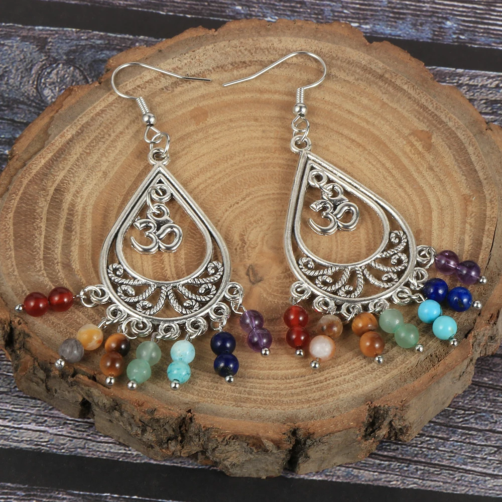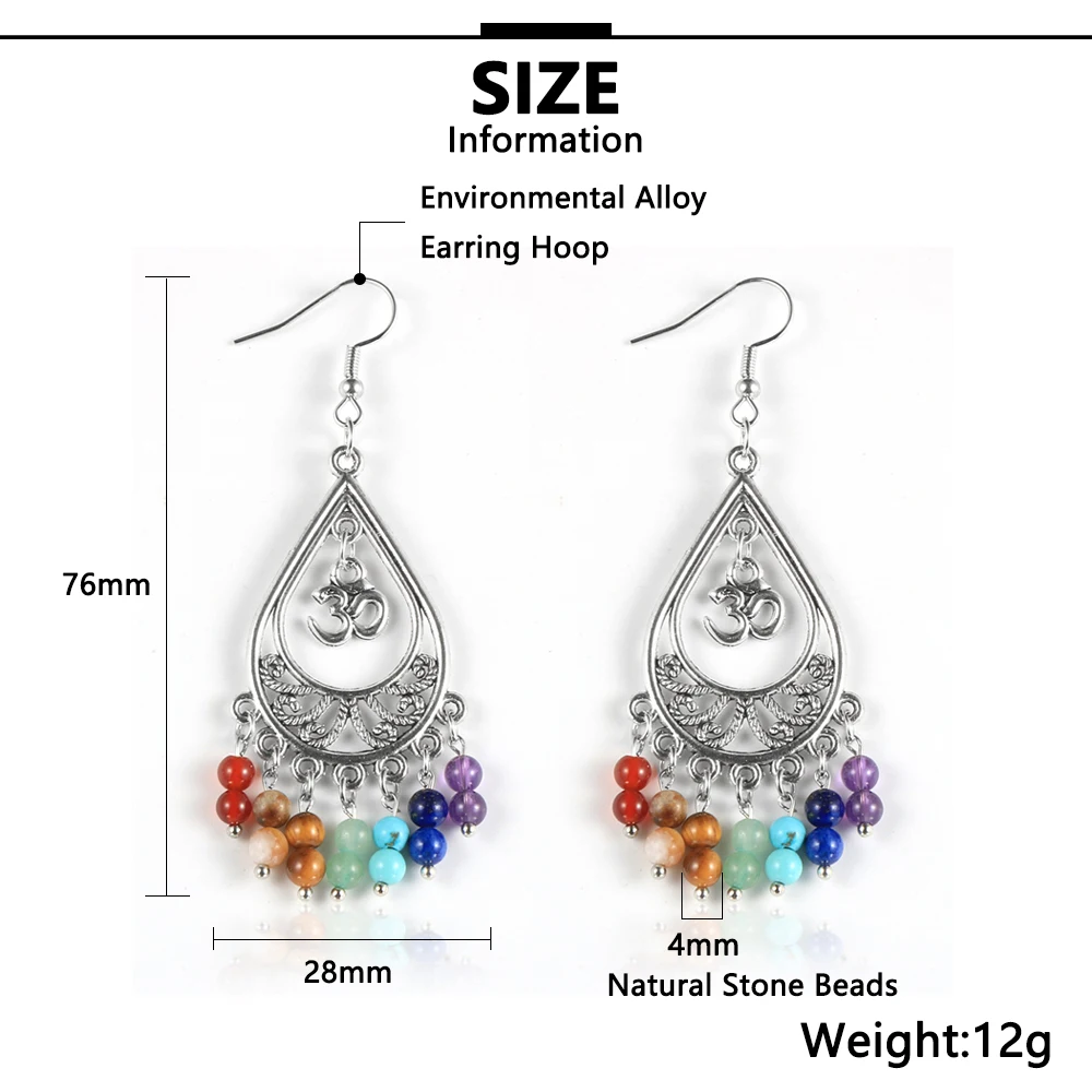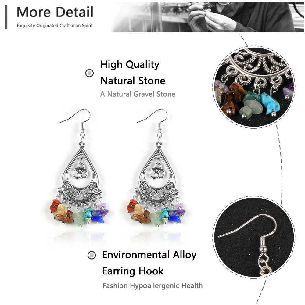 Item:Women Natural Stone 7 Chakras Chip Gravel Earrings Metal Dorp Dangled Earring Hoop Yoge Healing Reiki OM Charm Hanging Jewelry