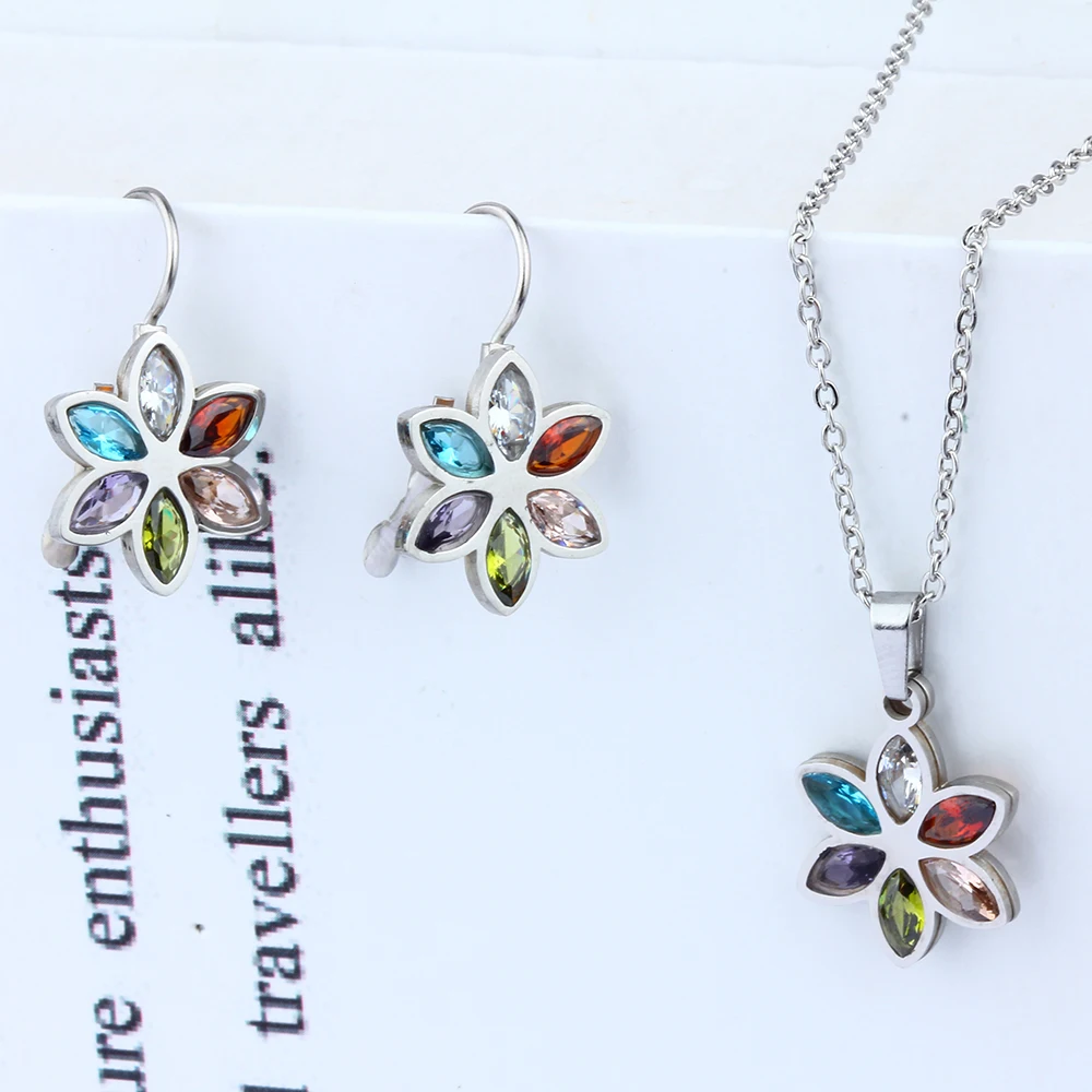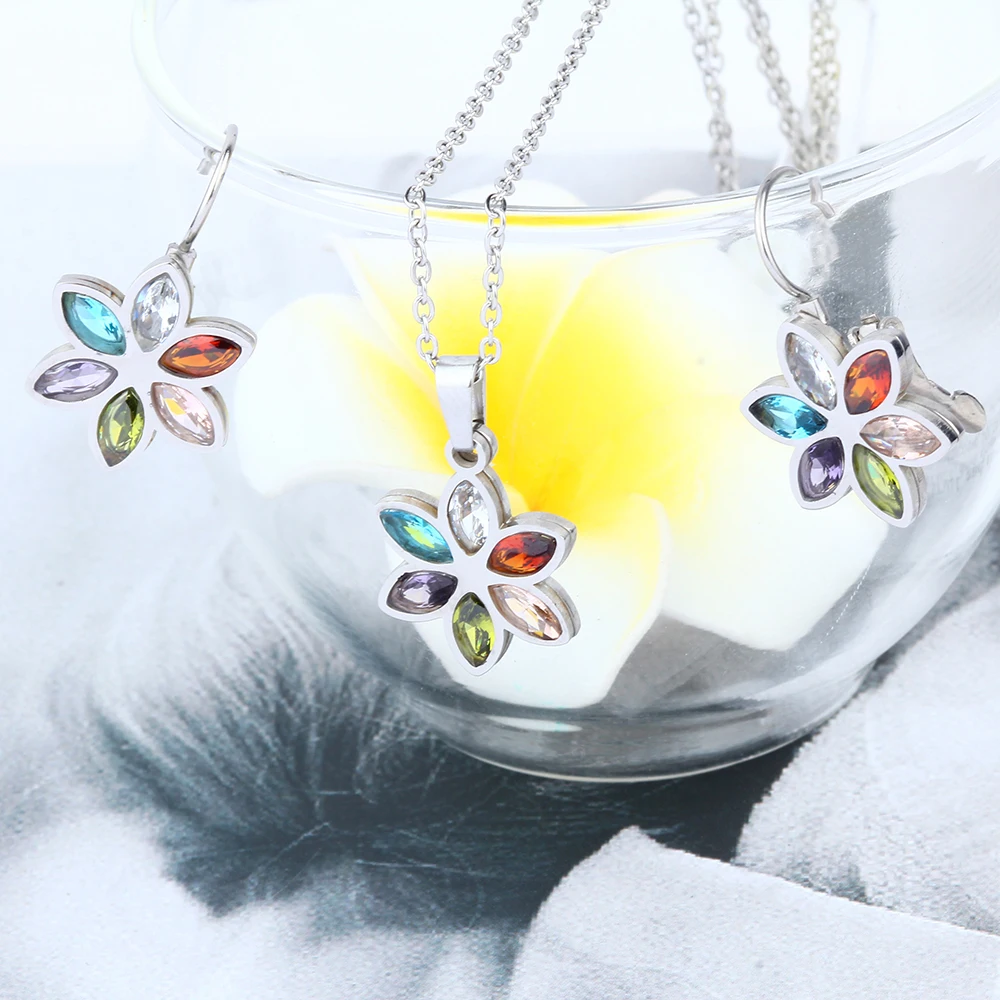 Silver Color Jewelry Set for Women Rainbow Cubic Zirconia Hoop Earrings Necklace Pendant Ring Party Birthday Gift